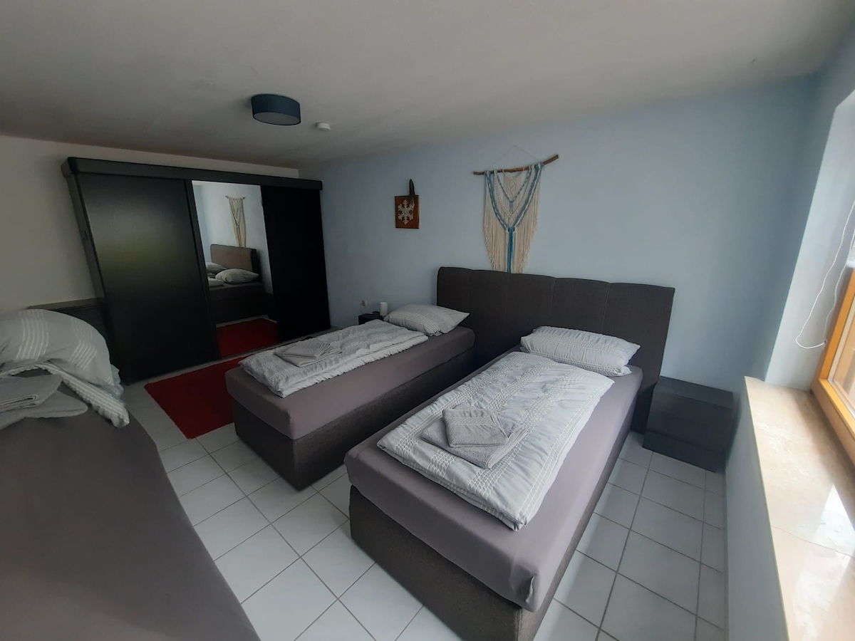 Voll ausgestattete Ferienwohnung, bestehend aus 2 Schlafzimmern, Flur, gut ausgestattete Wohnküche, großes Bad. 1. Schlafzimmer: 1 Bett 140 cm und ein Einzelbett, Kleiderschrank, Sideboard und großer TV, 2. Schlafzimmern: 1,80 x1,80 großes Hochbett, Schlafcouch (ca 1,40) Schreibtisch und Kleiderschrank. Haustiere sind ebenfalls erlaubt nach vorheriger Absprache. Parken im Hof ebenfalls möglich. Einkaufsmöglichkeiten direkt vor der Haustür.