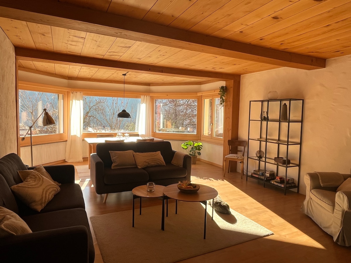 "Inmitten der majestätischen Berge erwartet Sie ein zauberhaftes Chalet mit einem atemberaubenden Blick auf den See und die Alpen. Zentral gelegen, bietet es Zugang zu Geschäften und öffentlichen Verkehrsmitteln. Hier vereinen sich Gemütlichkeit und Natur zu einem friedlichen Rückzugsort. Erleben Sie die Schönheit und Bequemlichkeit dieses Zuhause und geniessen Sie einen unvergesslichen Aufenthalt voller Herzlichkeit.