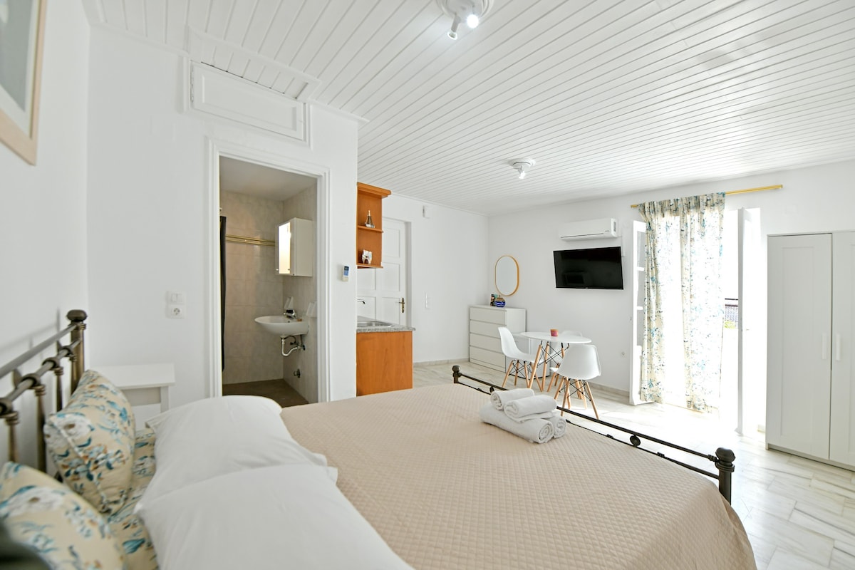 Kick back and relax in this calm, stylish room with big and beautiful balcony with a great sea view over the entire Askeli beach area. It has a fully equipped kitchen, smart tv and is only a 40 meters away from the biggest beach of Poros. Supermarket, bakery, bike rental and great restaurants are nearby. Aida studios is located in Askeli area on Poros island. It is higher up which gives it a great view of Askeli beach but it also means the road to get there is uphill and quite steep.