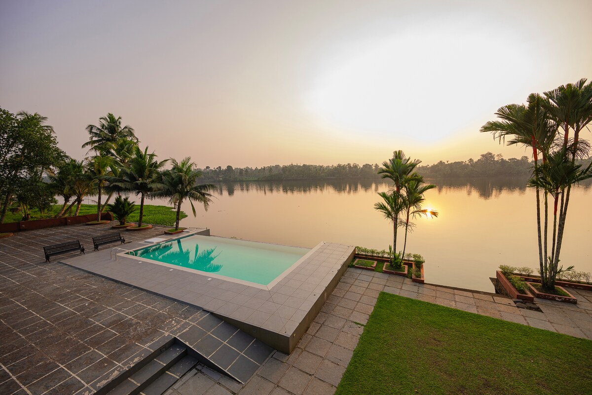 A stunning 6-bedroom riverside retreat nestled in the serene surroundings of Manjaly. Perfect for families, groups, or corporate events, this spacious property features an expansive lawn for gatherings and an infinity pool with tranquil river views. Enjoy activities like boating, campfires, and barbeques for a truly relaxing stay.