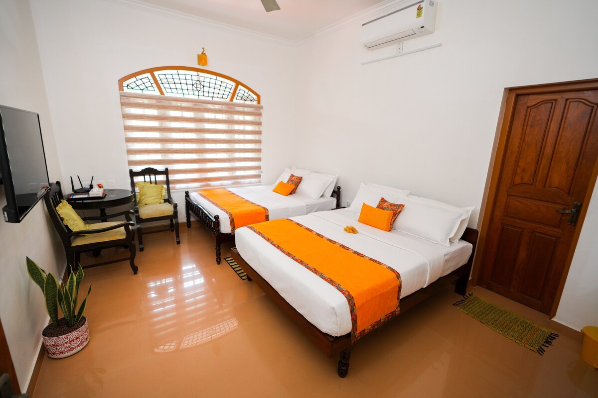 "Parudeesa" (Heavenly) is a luxury home with Indian decor and western conveniences based in Kerala. The home is dedicated to guests only. No staff live onsite. The house manager lives nearby and can assist with local knowledge, arrange drivers/taxis and translate from English when needed. There is a house phone available to call the house mgr. The shared spaces are cleaned daily. There are five Private guest suites which are lockable in this home. This listing is for the " KARMA " suite.