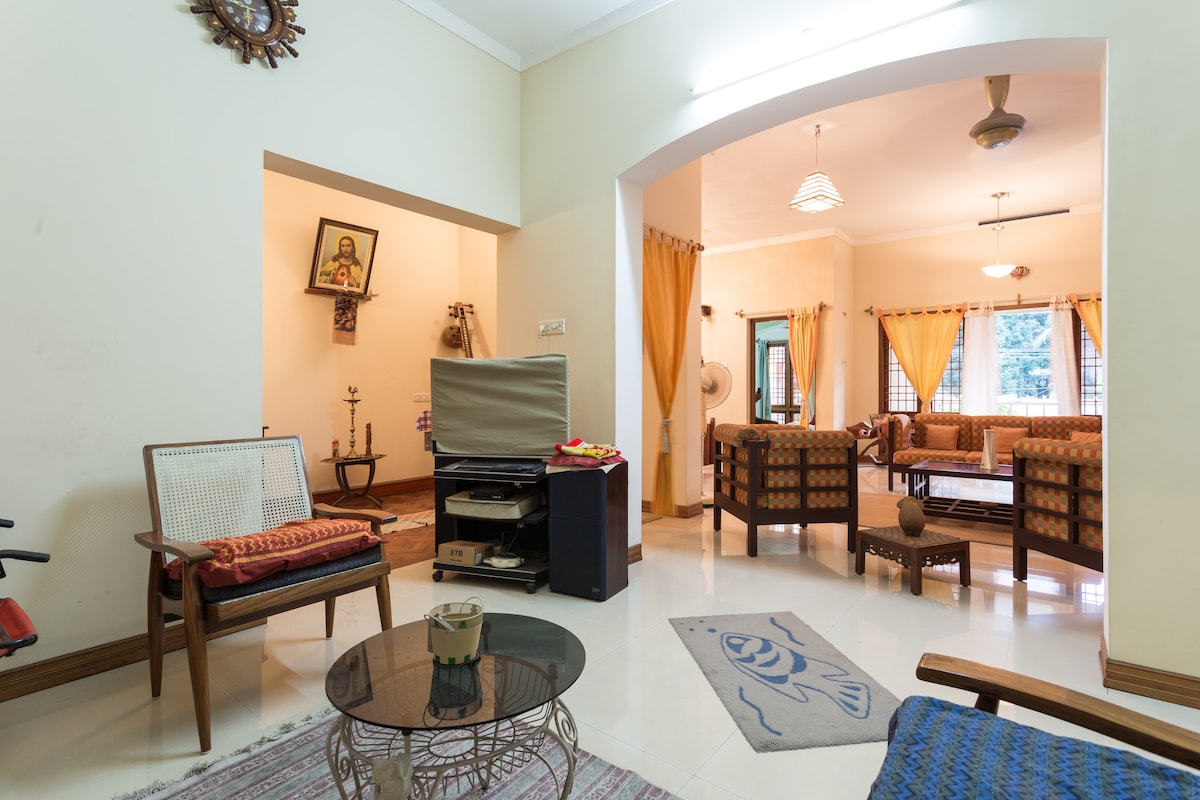 Guests enjoy private entry & access to the entire top floor of our home. Step into a wide living room, recreation room, fast internet, work from home & study set-up, kitchenette, balcony & spacious A/C bedroom. We are 5-7 minutes walk from the nearest Kochi Metro, auto & bus station, Renai Multispeciality Hospital & International Stadium. As President of our Homeowners Neighborhood Association, you are in safe hands in this quiet iconic neighborhood with interesting cafes, yoga spots & such.