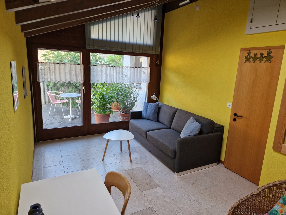 Das Studio (ca. 30m2, ein grosser Raum) mit grosser Terasse mit einer atemberaubenden Aussicht auf die Berge, liegt im Erdgeschoss unseres Hauses. Es ist durch einen eigenen Zugang erreichbar. Das Studio ist einfach, vollständig und zweckmässig ausgerüstet und verfügt über eine offene Küche, ein Badezimmer, sowie Schlafmöglichkeiten für 2-4 Personen (Doppelbett und Schlafsofa für max 2 Personen). Grosse Fenster ermöglichen es, auch im Studio das herrliche Panorama zu geniessen.