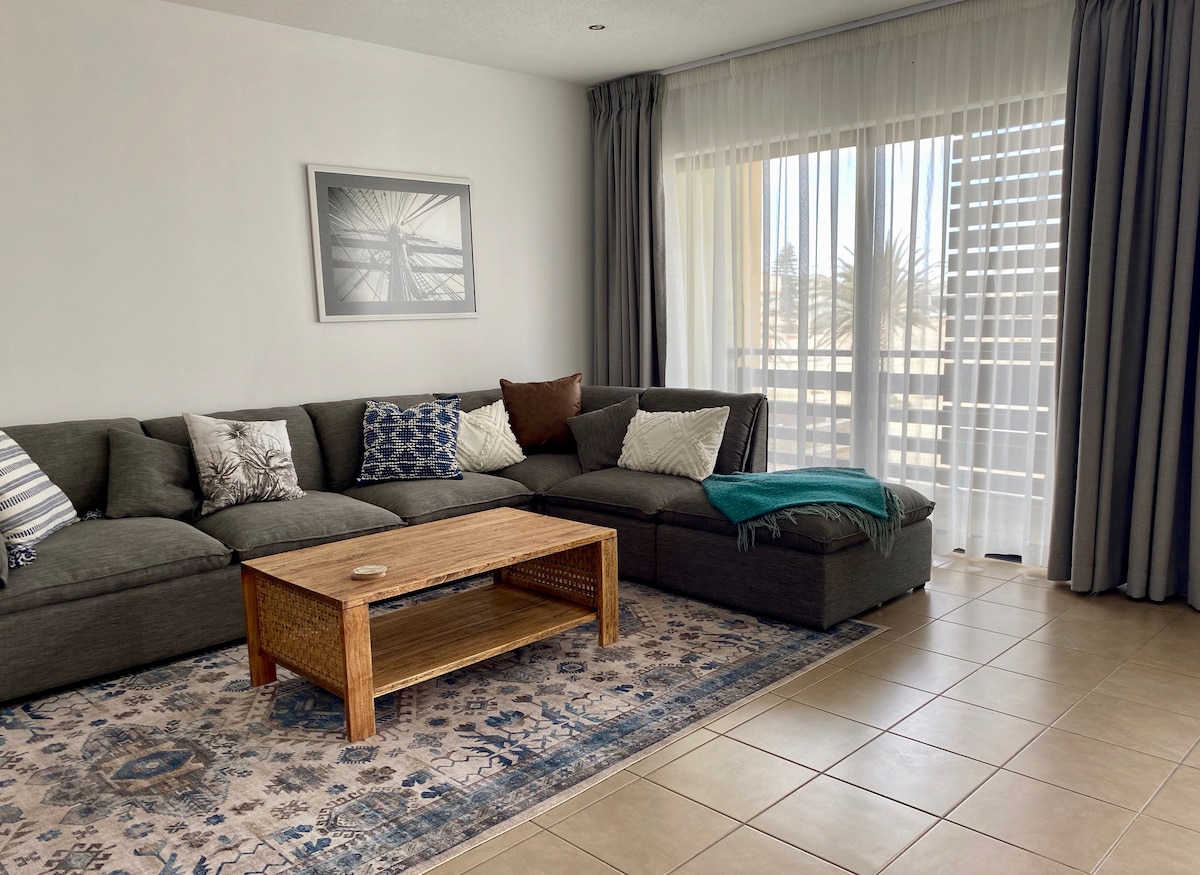Our apartment is centrally located with secure parking. It boasts large open plan spaces with two bedrooms and well appointed bathrooms. The large kitchen is great for self-catering kitted out with everything a home cook needs. The big couch and big screen TV makes lazing around a pleasure, especially with the full balcony offering views over the Namib Desert. Comfy beds and luxury towels make this apartments the perfect place to relax.