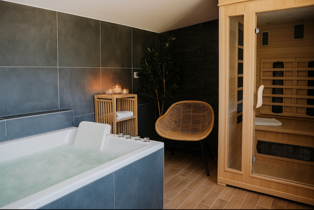 Bienvenue dans notre Lodge « bien être » classe 4* à Binic Etables-Sur-Mer ! La situation est idéale ! 500m de la plage du Moulin et du centre du village (boulangerie, restaurants…). Ici c’est le calme absolu ! Une terrasse couverte entourée de végétations vous permettra de vous détendre avant de rejoindre la pièce privative où vous profiterez d’une grande balnéo 2 personnes et d’un sauna infrarouge. Lumière tamisée, sel de bain, musique zen 🧘🏼♀️… tout est pensé pour votre confort.