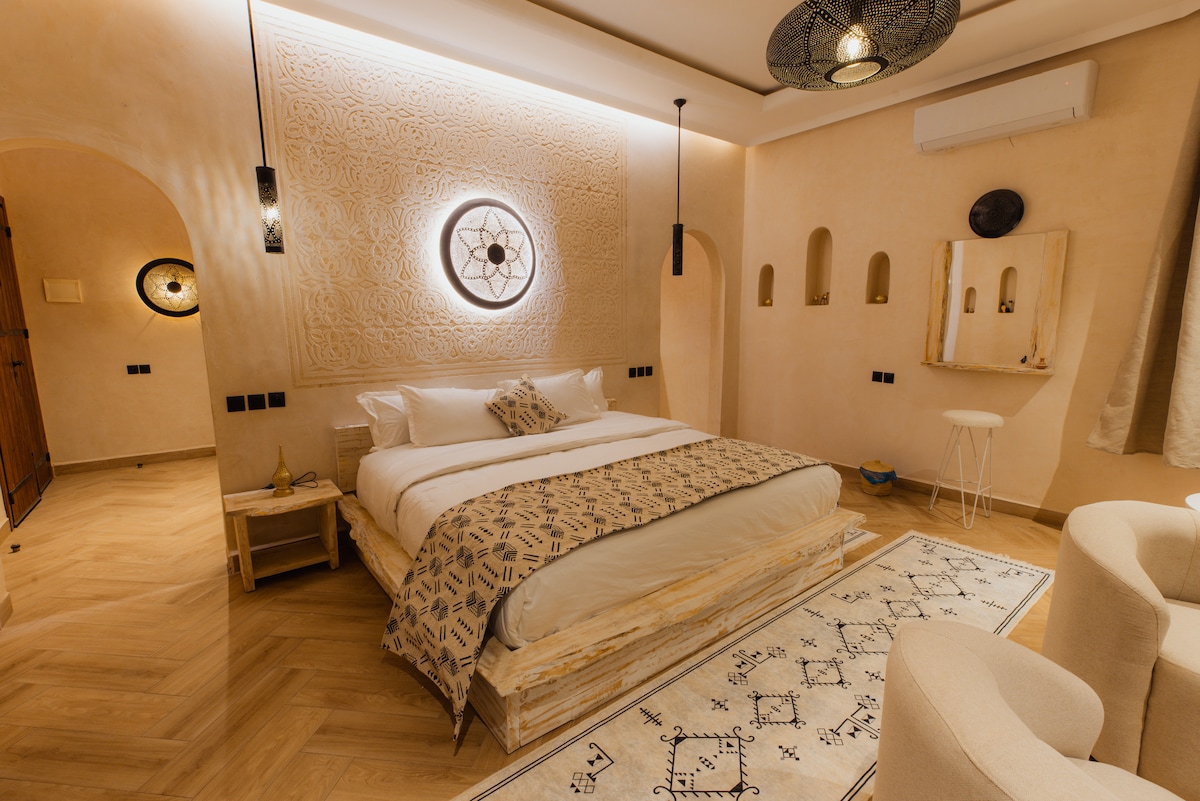 Bienvenido al Riad Akabar Merzouga 🌴 Un lugar único que combina la auténtica hospitalidad marroquí con la magia del desierto, donde reina la tranquilidad, abundan los cielos despejados y las doradas arenas de Merzouga se extienden hasta donde alcanza la vista. Este riad ofrece una experiencia inolvidable, tanto si buscas relax como aventura. Disfruta de impresionantes amaneceres y atardeceres entre las dunas y pasa noches tranquilas bajo las estrellas del desierto.