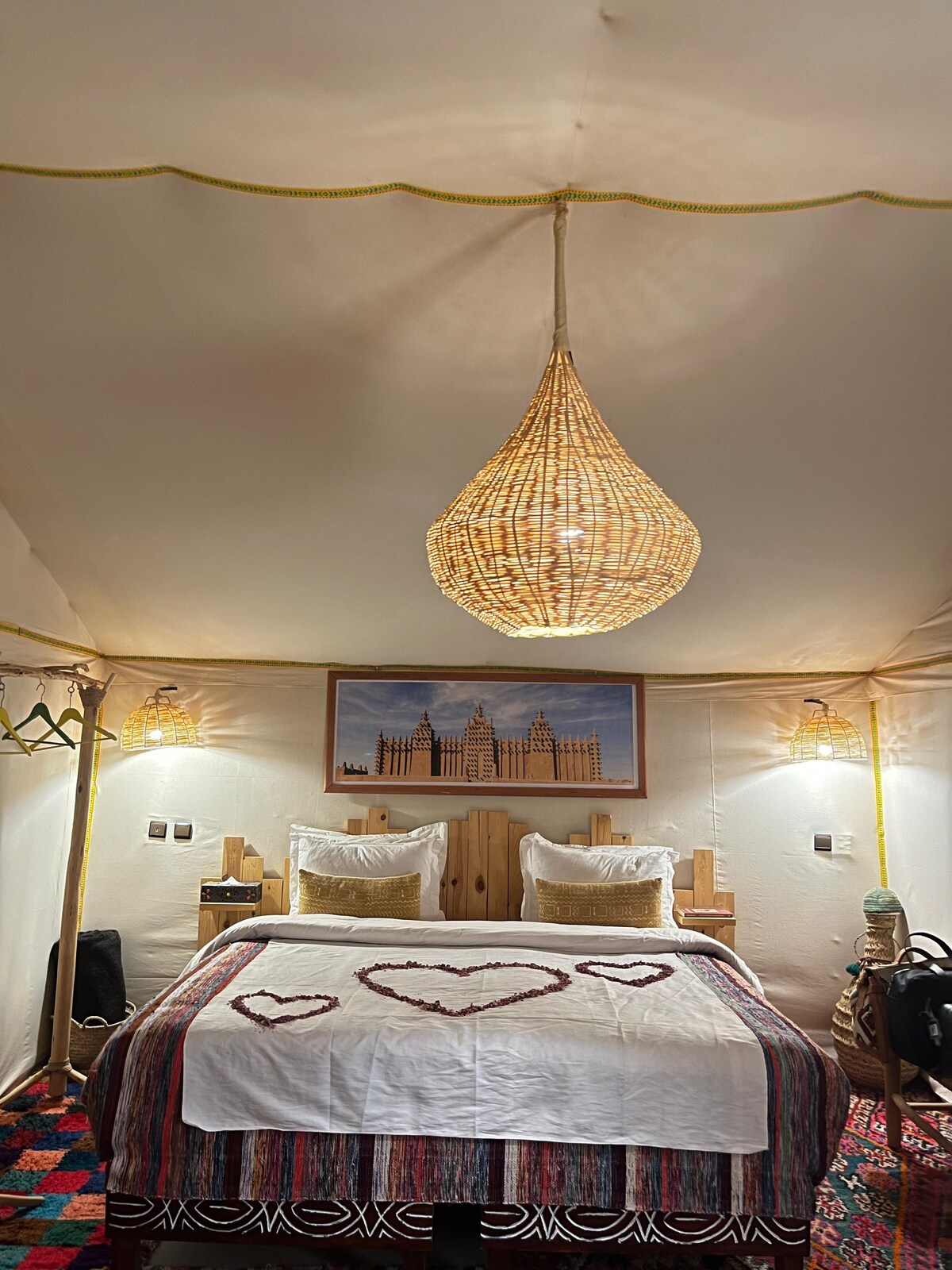 This luxurious desert camp is easily accessible by car. Despite its proximity to the village, it's situated right in the middle of the sand dunes, offering a panoramic view of some of the largest dunes. As locals, we can arrange activities and accommodate any additional requests. We provide private tents, each with its own bathroom, toilet, and air conditioning for both cooling and heating. We also offer dinner upon request. Everyone is welcome in the desert.
