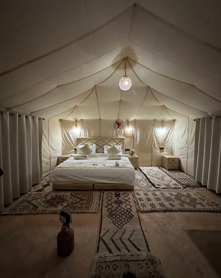 My luxury tent in Merzouga is an extraordinary oasis nestled amidst the mesmerizing dunes of the Sahara Desert. Surrounded by breathtaking landscapes, this unique accommodation offers unparalleled views of golden sands stretching as far as the eye can see. Inside, my spacious tent is adorned with exquisite Moroccan decor and equipped with all modern comforts—plush bedding, a private bathroom with hot water, and air conditioning for those warm desert nights.