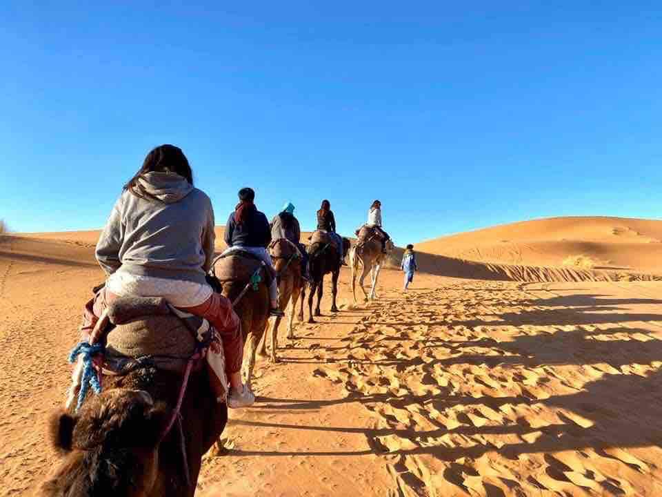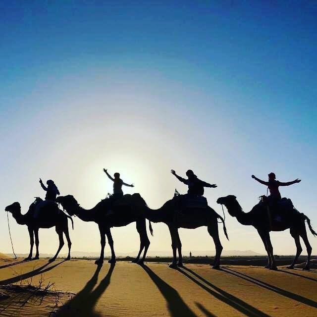 we shall meet in the meeting point where you will park your car. You will be then pick up by 4x4 to start your camel ride. You will stop in the middle of the dunes to watch the sunset and then you will continue to the camp. In the camp, you will be welcomed with tea and berber smiles. After a delicious dinner, the joy will start with drums and berber music around the bonfire. Or simply you can have a walk under the starry night. In the morning after the breakfast, you will take camels back .