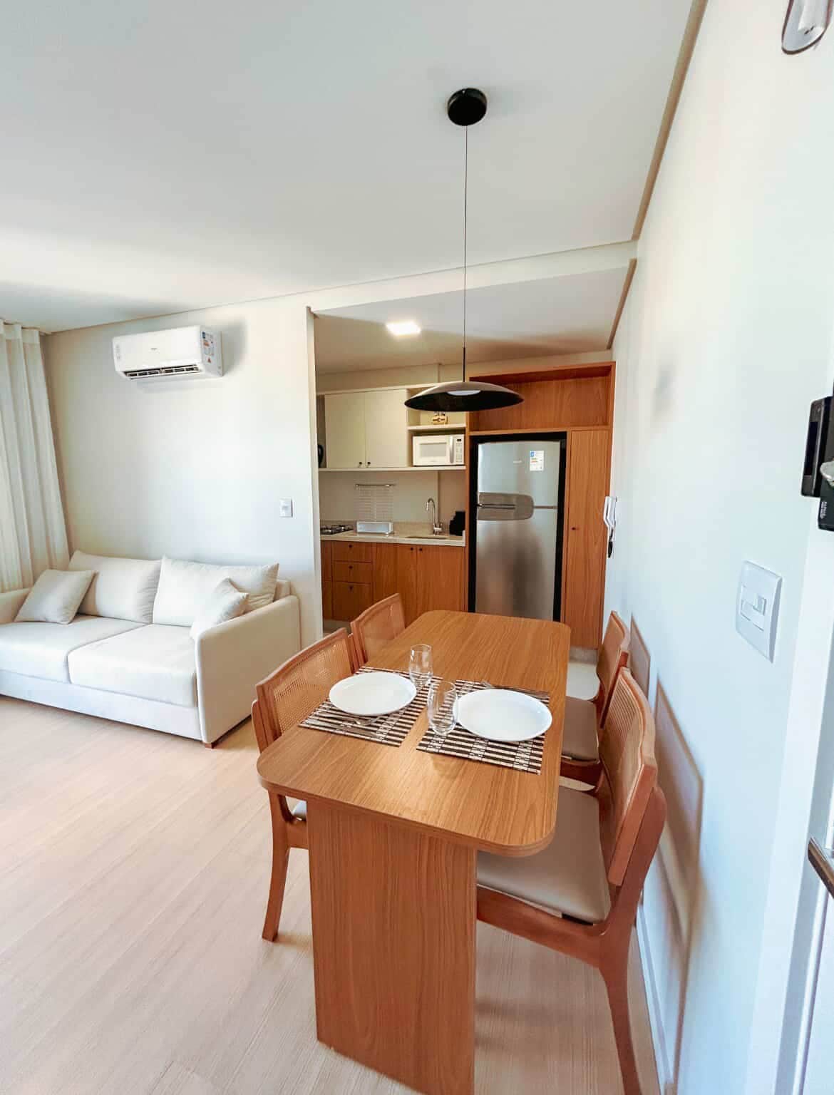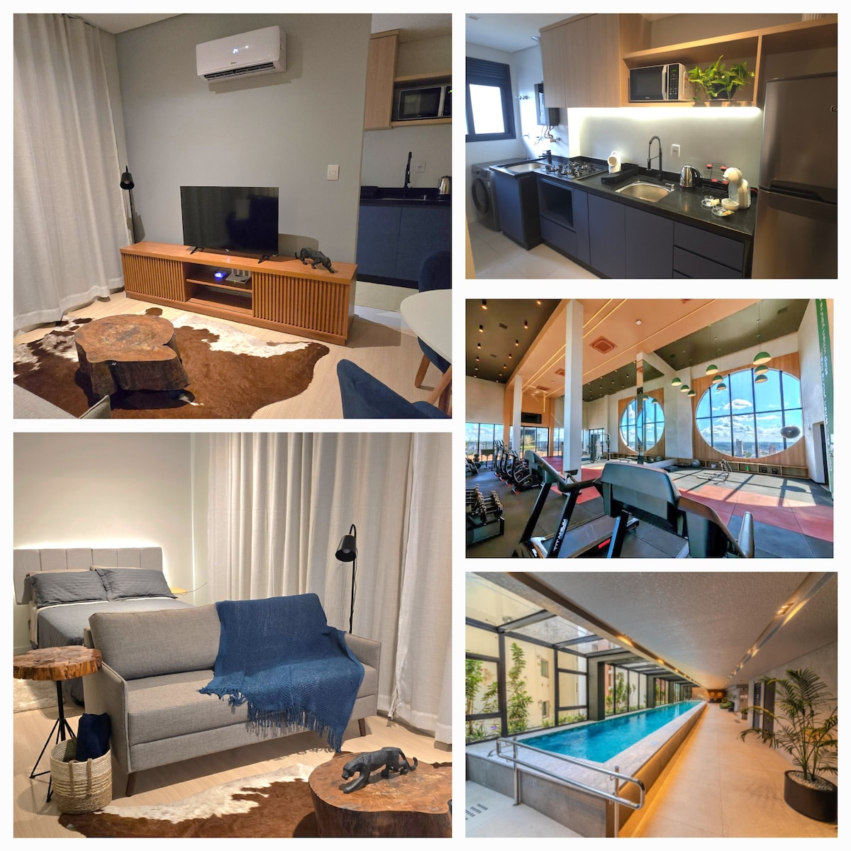 Studio completo e aconchegante! Hospede-se com conforto e praticidade, ideal para casais, famílias pequenas ou quem viaja a trabalho. O espaço conta com: 1 cama de casal, 1 sofá, 1 banheiro totalmente equipado, cozinha completa com utensílios, geladeira, fogão, micro-ondas e chaleira elétrica, máquina de lavar roupas, TV e Wi-Fi, climatizador e 1 vaga de garagem. Tudo isso em um condomínio completo, com infraestrutura de lazer e conveniência. Ideal para quem busca conforto e funcionalidade.