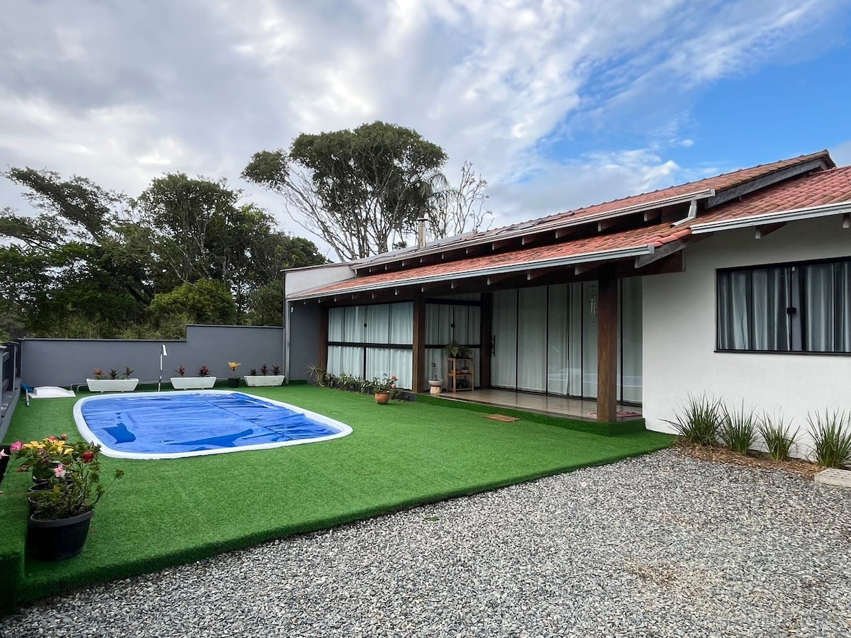 Relaxe com toda a família nesta acomodação tranquila, praticamente sem vizinhos ao lado, escute o canto dos pássaros realmente um lugar super tranquilo para relaxar. Os quartos possuem ar condicionado, a piscina com aquecimento solar, sofa para 5 pessoas churrasqueira integrada em Inox, situada a 200 metros da praia. Possue uma sala externa aconchegante. Grama sintetica ao redor da piscina sem risco de queda e um toque de charme. Pra quem gosta de co forto e tranquilidade, Tv 50`, Wi-Fi