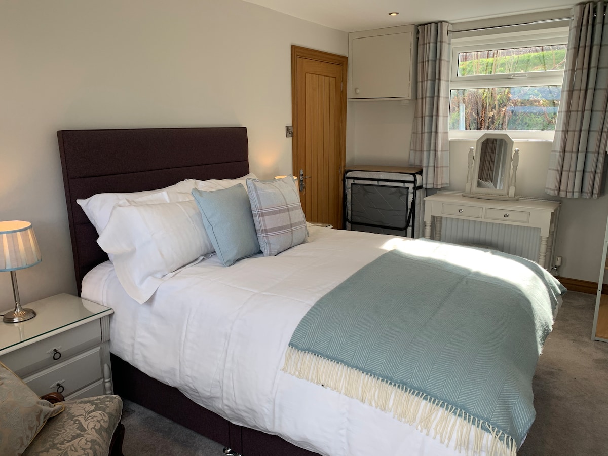 One of our double rooms on the back of the property with its own bathroom and shower, A double bed with storage below a smart tv connected to a fast network, fresh linen and towels, Hairdryer, Shampoo Soap and water. Storage room is available for bikes. the room is offered room only, with a coffee shop, Traditional bar and games room. Starting from the property you take numerous walks and have mountain bike trails and salmon fishing on your doorstep.