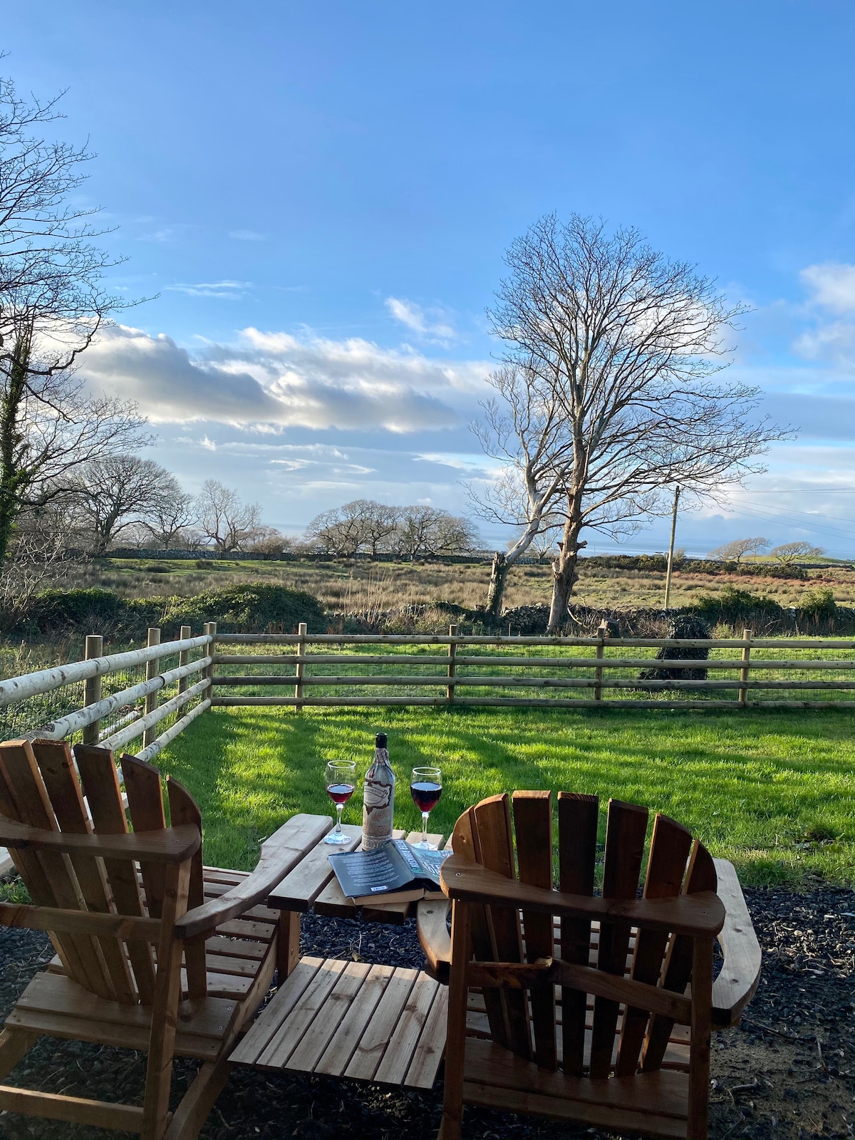 Luxury shepherds hut with underfloor heating, log burner, king-size bed, en suite shower room & uninterrupted views of Snowdonia & the sea. Sitting in it's own field, our accommodation is part of eight acres of beautifully maintained private grounds with free-range chickens & ducks, pigs, red squirrels & barn owls. It is a truly tranquil retreat but is also perfectly located for those wishing to explore the island of Anglesey & the Snowdonia National Park is just 25 minutes away by car.