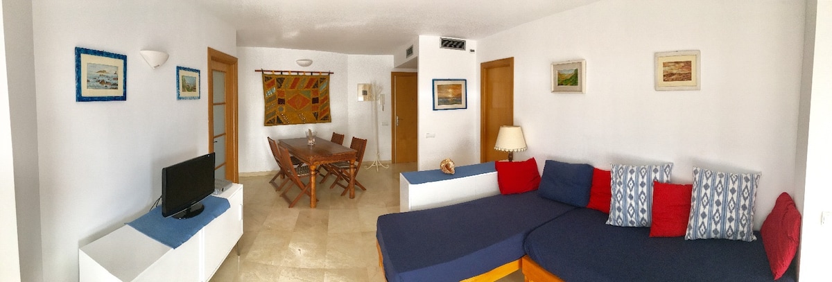 Appartement refait à neuf, tout confort. Situation idéale : dans une zone calme d'Es Pujols mais à proximité de tous les commerces et restaurants. La plage est à 200 mètres, 3 minutes à pied. Spacieux salon avec cuisine ouverte, terrasse avec vue sur la pinède et la mer. 2 chambres équipées de climatisation réversible, 1 salle de douche. Très confortable, bien décoré et équipé, idéal en été comme hors saison, en famille ou entre amis. Titulaire de la licence touristique.