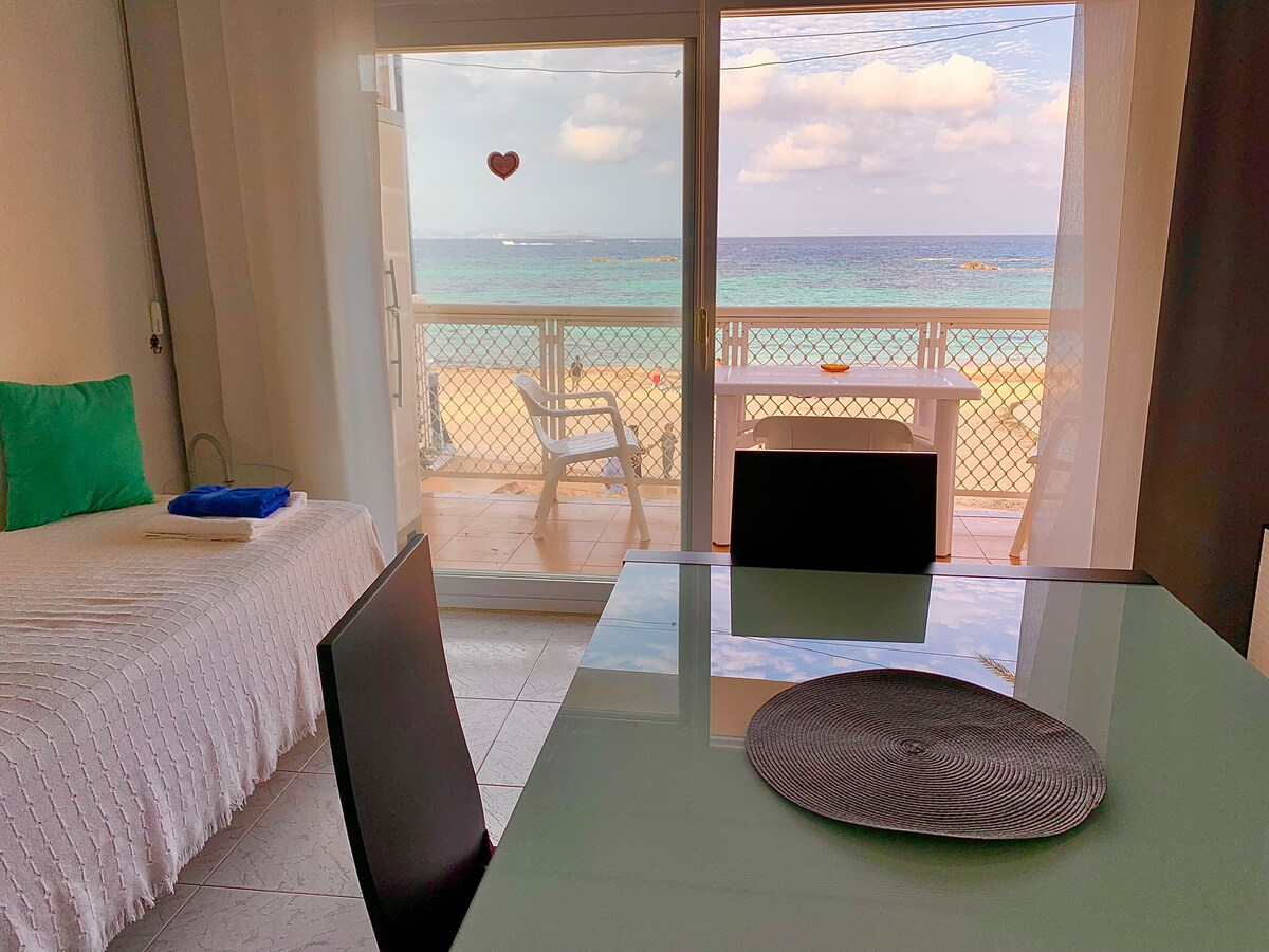 Disfruta de una experiencia con estilo en este alojamiento situado en primera línea de mar en Es Pujols, Formentera. El apartamento tiene una habitación, un baño, salón, cocina y balcón. Vistas al mar desde cualquier zona.