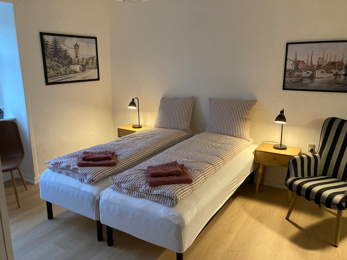90 m2 nyrenoveret lys lejlighed beliggende i rolige omgivelser ved Nørreskoven. Indeholder: Pæn indgang med hylde og bøjler. Dejlig stort køkken med stort set alt i inventar. 2 dejlige soveværelser, det ene med dobbeltseng, det andet med 2 ens enkeltsenge, begge soveværelser med persienner masser af skabsplads (skuffer, hylder og bøjler). Badeværelse med bruser. Dejlig stor kombineret stue/spisestue med chaiselong sofa, 55” TV m/stor tv-pakke samt wifi. Kvalitets sovesofa til 2 børn mod merpris