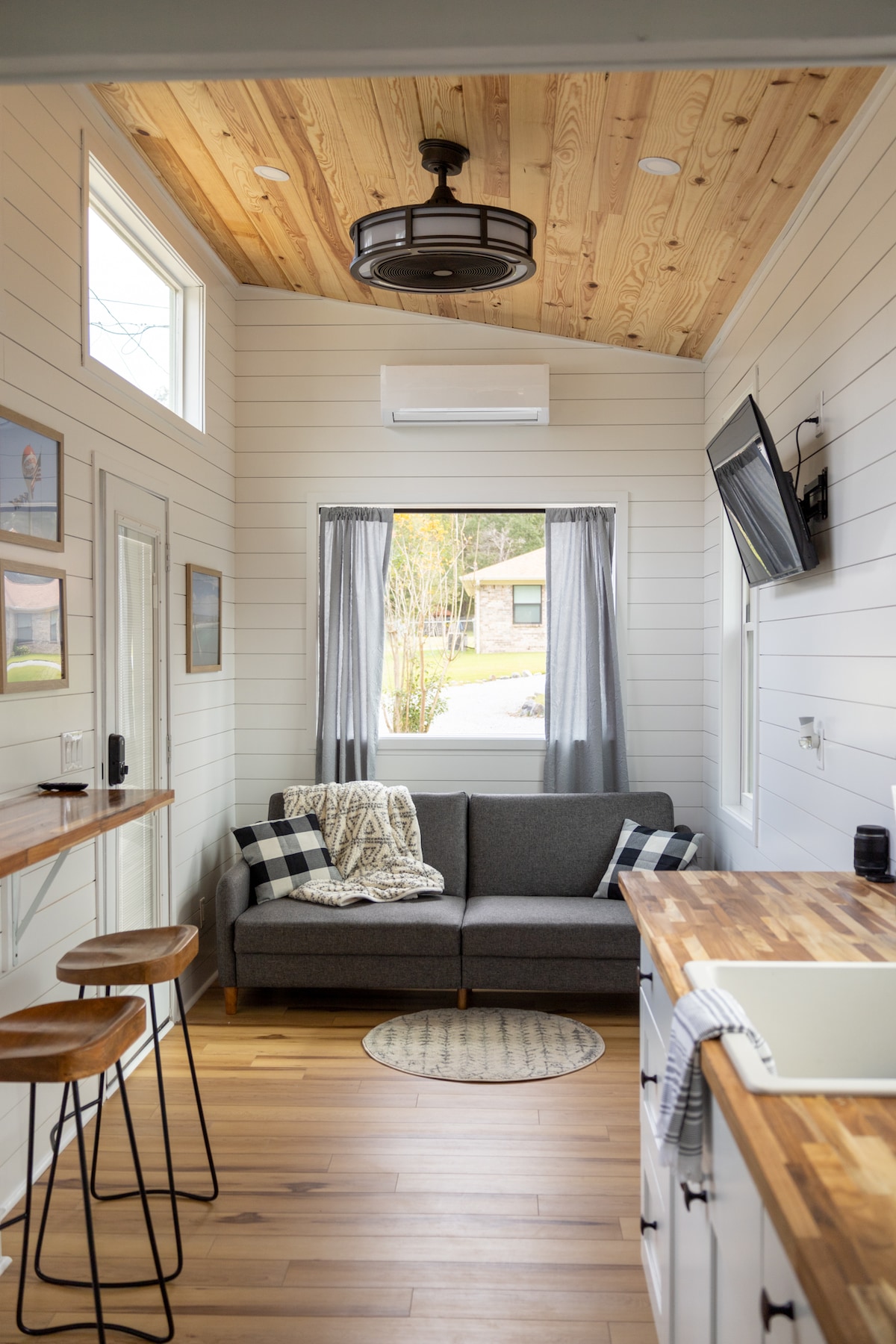 Welcome to our cozy tiny home located in my secured backyard, where a queen-sized bed promises a peaceful night’s sleep and our well-equipped kitchenette simplifies meal preparation. You will have free parking in the backyard located just steps away from the tiny home. Additionally, you’ll have the opportunity to gather around the outdoor fire pit for cozy evenings under the stars. Inside, unwind with a smart TV and stay connected with complimentary Wi-Fi.