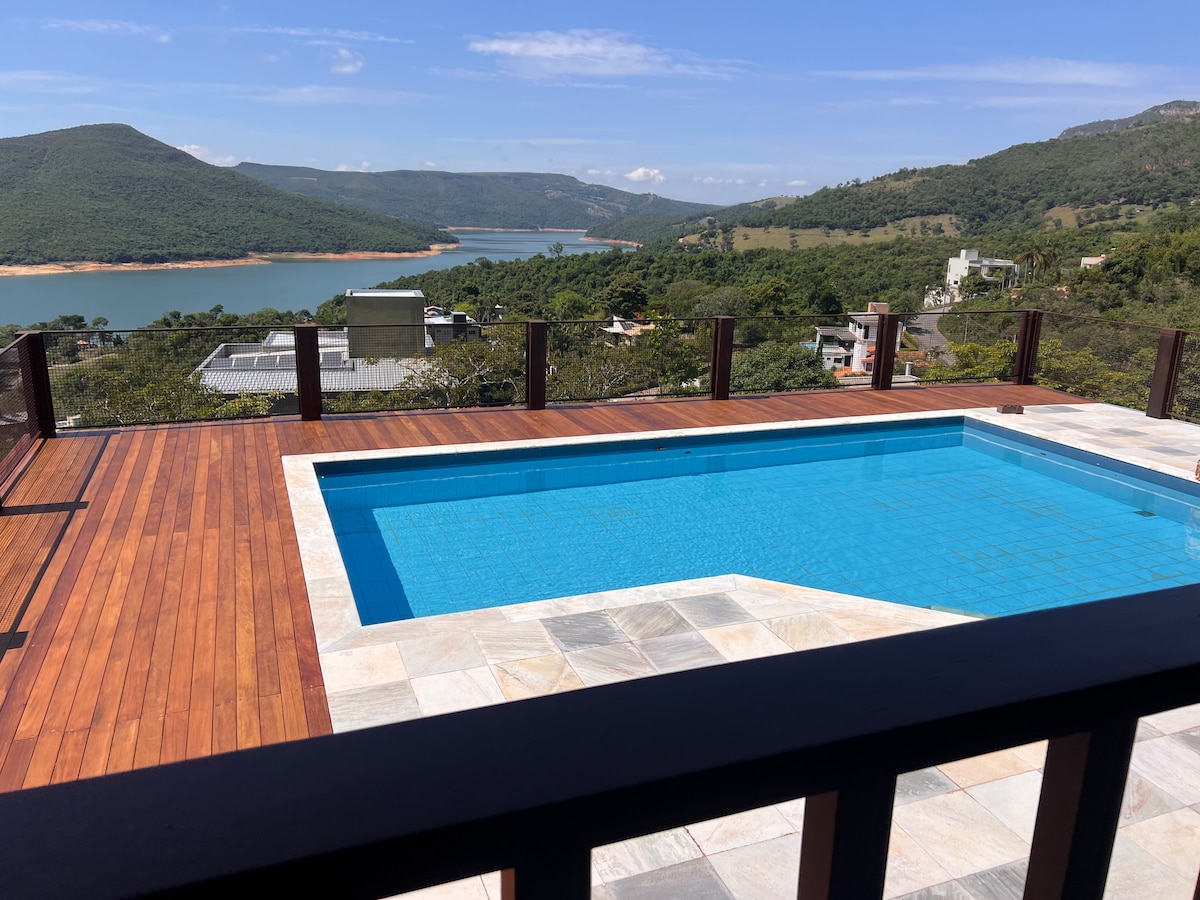 Casa em Capitólio Escarpas do Lago com vista para a Lagoa - 4 suítes , 2 semi-suites, acomodam até 20 pessoas, Wi-fi, Hidromassagem, piscina aquecida, sauna, churrasqueira, salão de jogos, mini-quadra de basquete, deck com vista infinita, espreguiçadeiras. Três suites com Ar condicionado, demais suítes com varanda e ventilador de teto. Vista para o lago, Hidro e lareira. São duas salas com Smart TV, lareira e varanda com redes. Cozinha com utensílios. Área de churrasqueira cervejeira e sinuca