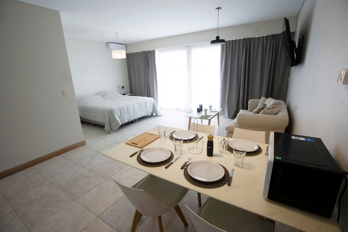 Es un estudio que cuenta con una cama doble y una single, un baño completo (con calentador de toallas, ideal para invierno). Tiene cocina abierta totalmente equipada con heladera, microondas (a convección, sustituye el horno tradicional), jarra térnica, tostadora, cafeteria eléctrica y licuadora. El departamento cuenta con aire acondicionado frio calor y un LED TV de 43" Los amenities del complejo hacen que sea un lugar único. Ideal para descansar y disfrutarlo todo el año. 10’ d Pilar centro