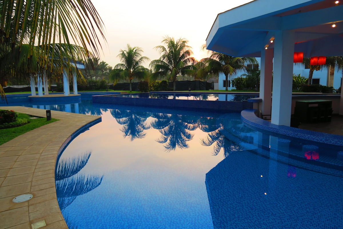 Villa Vacacional totalmente cómoda y equipada dentro de un condominio a la orilla de la playa. El condominio ofrece 3 piscinas grandes para que puedas difrutar con tu familia, amigos y sobre todo que estas en la piscina y puedes ver el mar y tener acceso directo a la playa.
