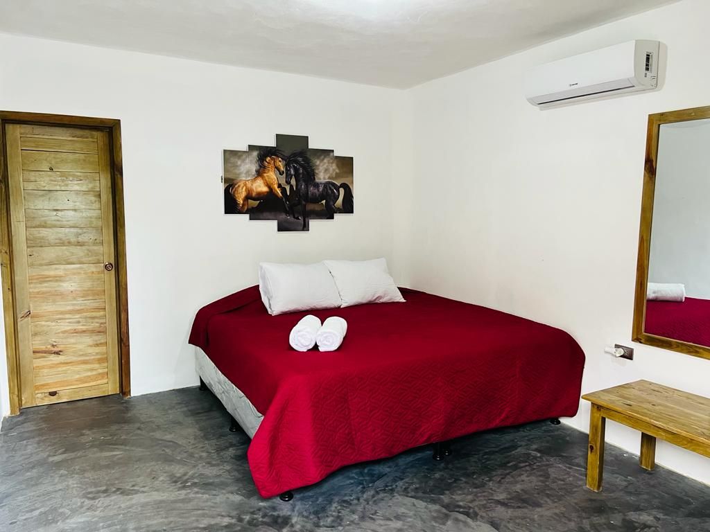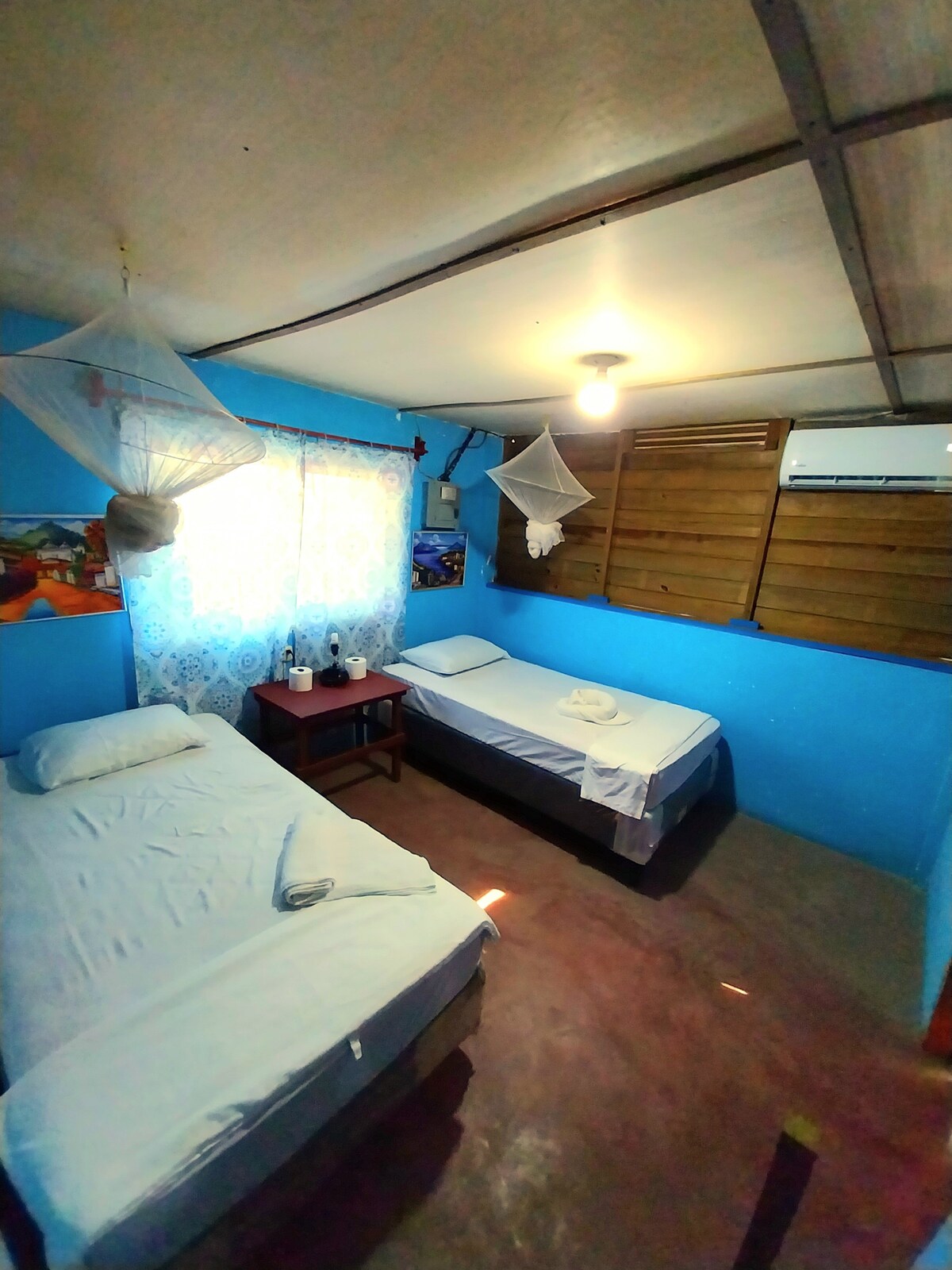 Tenemos 3 preciosas habitaciones que cuentan con baño privado, A/C, Smart TV y balcón. Hab. #1A: 2 camas matrimoniales para 4/p. Hab. #2A: 1 cama tamaño Queen para 1 ó 2/p. Hab. #3A: 2 camas tamaño Queen para 4/p. Tenemos un área con mesas, sillas y asador que pueden utilizar sin costo extra. La playa se encuentra a 200 m del hotel, pueden ir caminando si la marea lo permite o por medio de una lancha de pago en un viaje de 3 minutos. Pueden bañarse en la playa pública o en la bocabarra.