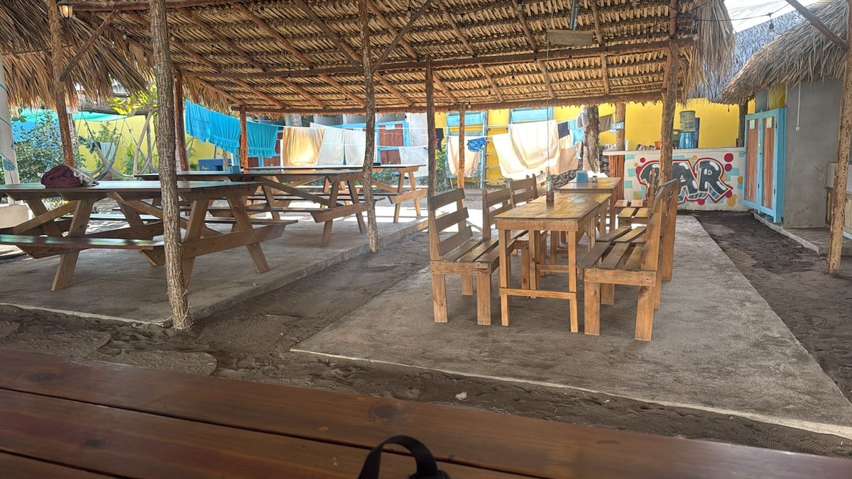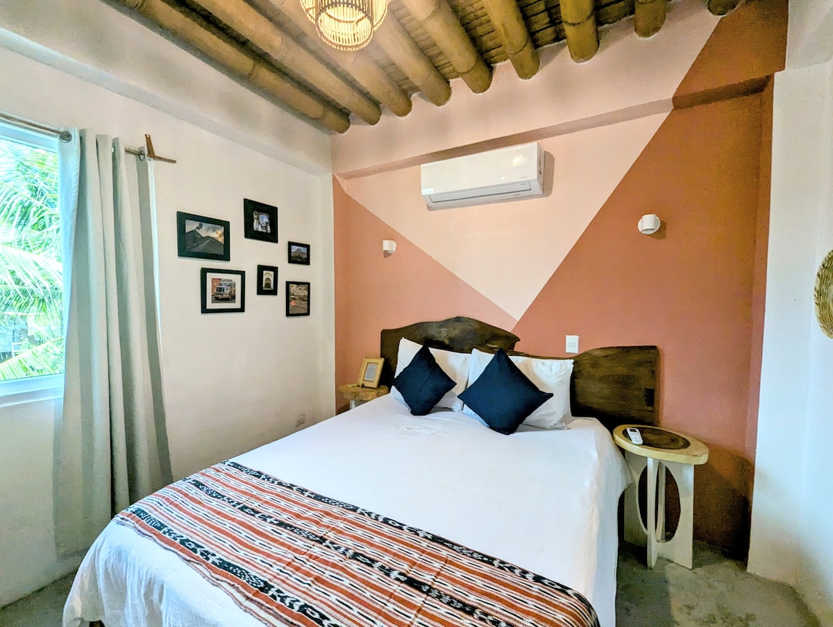Welcome to Hidden Wave Resort! Best value on a beautiful beachside property in El Paredon. Your private Queen bed ranchito has air conditioning and lots of light with a great view of the garden. The washroom is shared. Our resort has a beautiful big pool, shared kitchen, garden, and surf board rentals. We are a 10 second walk from the beach (you can hear the waves) and we are in the best central location in town - walking distance to all the best restaurants and bars. You don't need a car.