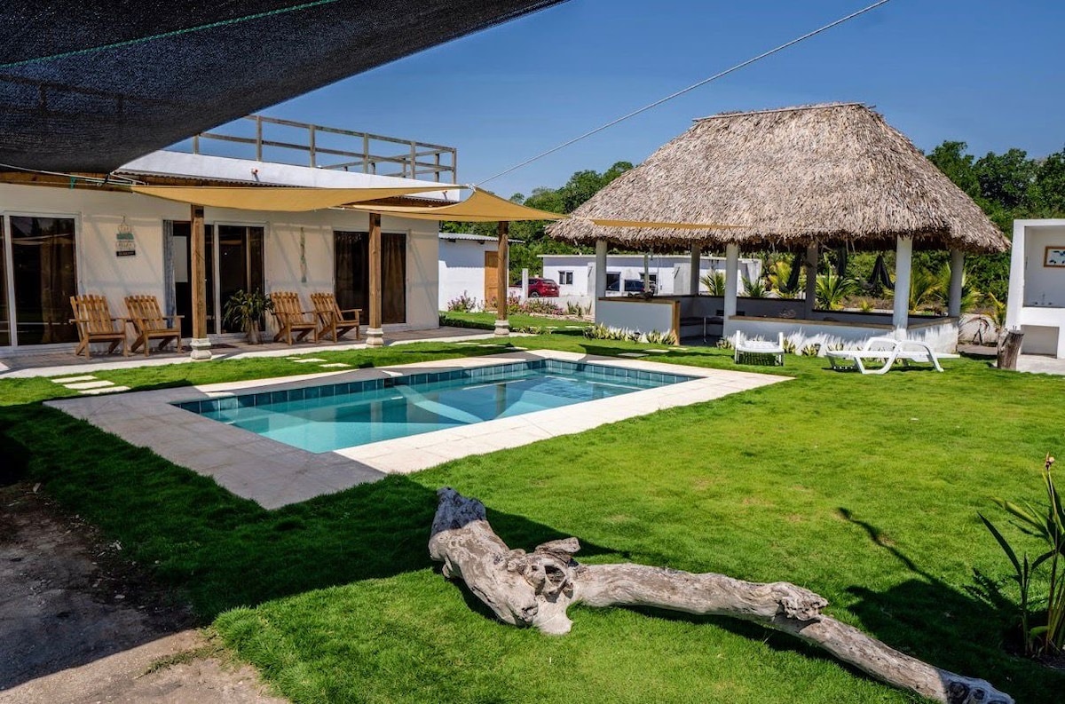 Con tu familia crea recuerdos inolvidables en esta casa en condominio seguro, con cocina moderna completamente equipada. Piscina privada grande con diferentes alturas para todas las edades, y múltiples sombrillas para tener sombra en la piscina. Acceso privado a la playa. Mesa de Ping-Pong, Juegos de niños y jardín de 500 metros para juegos al aire libre. Duerme cómodamente en 5 habitaciones con aire y TV, 16 camas en total. Parqueo para 4 carros dentro de la propiedad, más parqueos de visita.