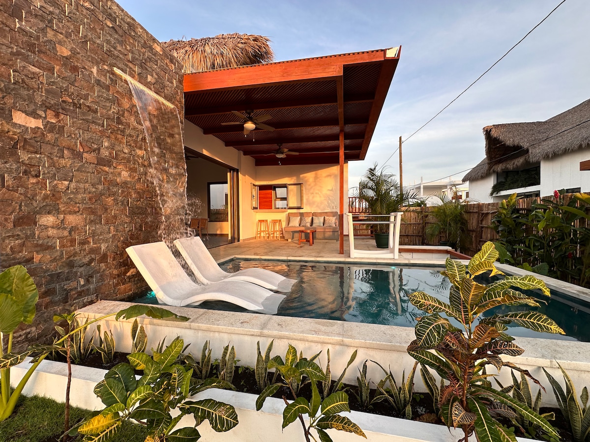 Aranxä: a refuge inspired by the orange sunsets of El Paredón. The house is situated facing the sea, and from every room, you will have a view of the Pacific Ocean; it is paradise for those looking to disconnect and relax. Its design is spacious, inspired by Indonesian architecture. It includes a cook and concierge, with a menu of local food offered. Bungalows with private bathrooms and luxury finishes. The pool and terrace also have a view of the sea and the best sunsets.