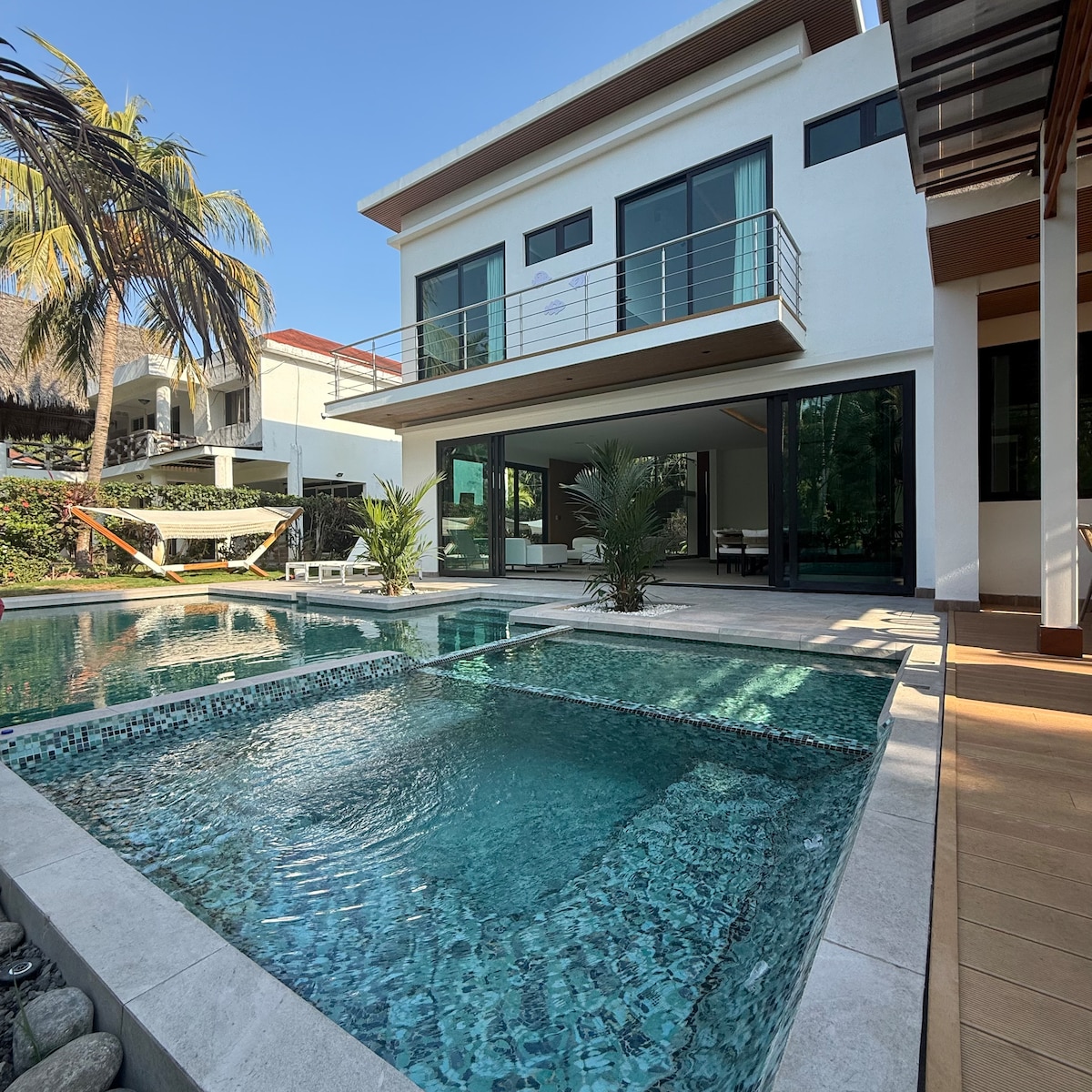 Con tu familia crea recuerdos inolvidables en esta casa en condominio seguro, con cocina moderna completamente equipada. Piscina privada grande con diferentes alturas para todas las edades, y múltiples sombrillas para tener sombra en la piscina. Acceso privado a la playa. Mesa de Ping-Pong, Juegos de niños y jardín de 500 metros para juegos al aire libre. Duerme cómodamente en 5 habitaciones con aire y TV, 16 camas en total. Parqueo para 4 carros dentro de la propiedad, más parqueos de visita.