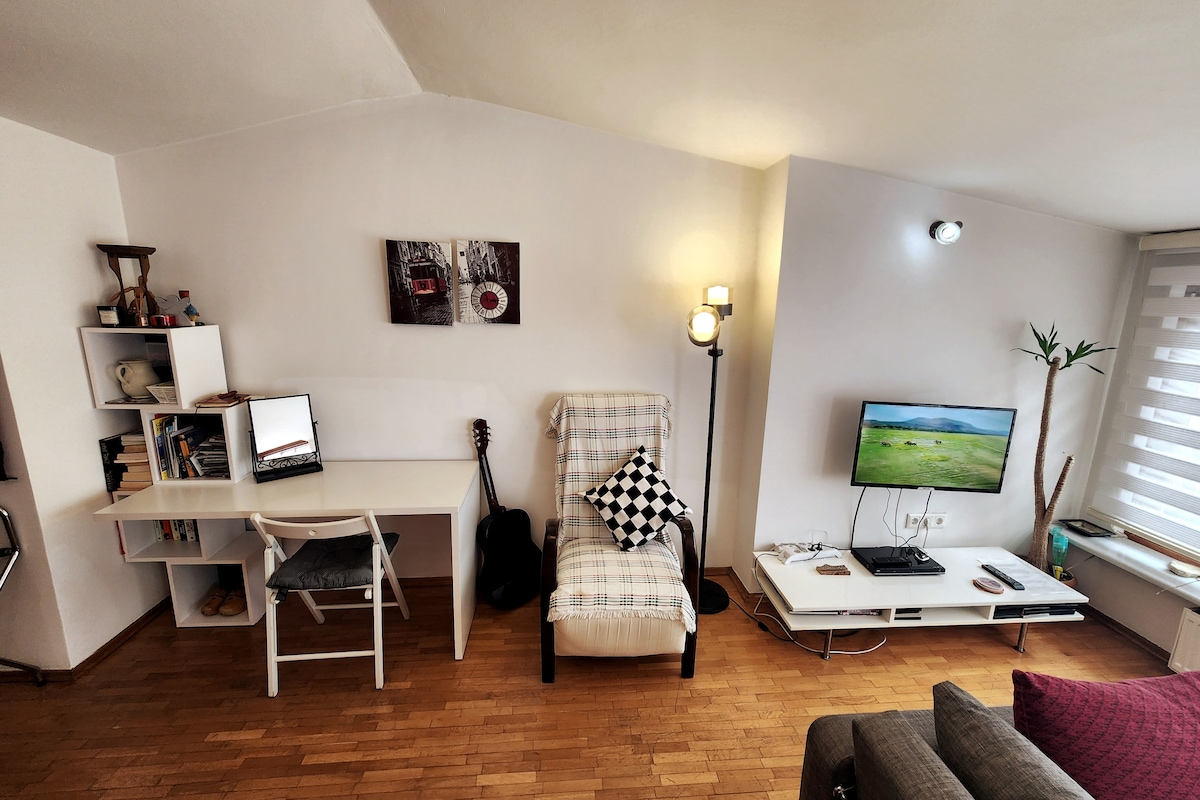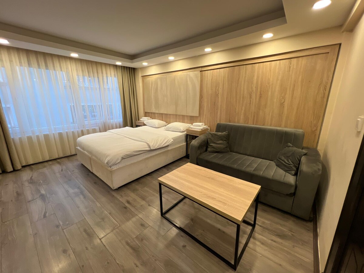 Enjoy a stylish experience in this centrally located apartment. Our apartment can accommodate 3 people with 1 queen bed and a sofa bed that can be converted to bed. Wi-Fi/Smart TV (you can watch movies for free with an active Amazon Prime account). Indoor parking is available. It has a clear view of the city.14 minutes from TUYAP congress by car. there is many materials at kitchen. The location is central, with many markets, cafes, restaurants, shopping malls, hospitals, and bus stops nearby.