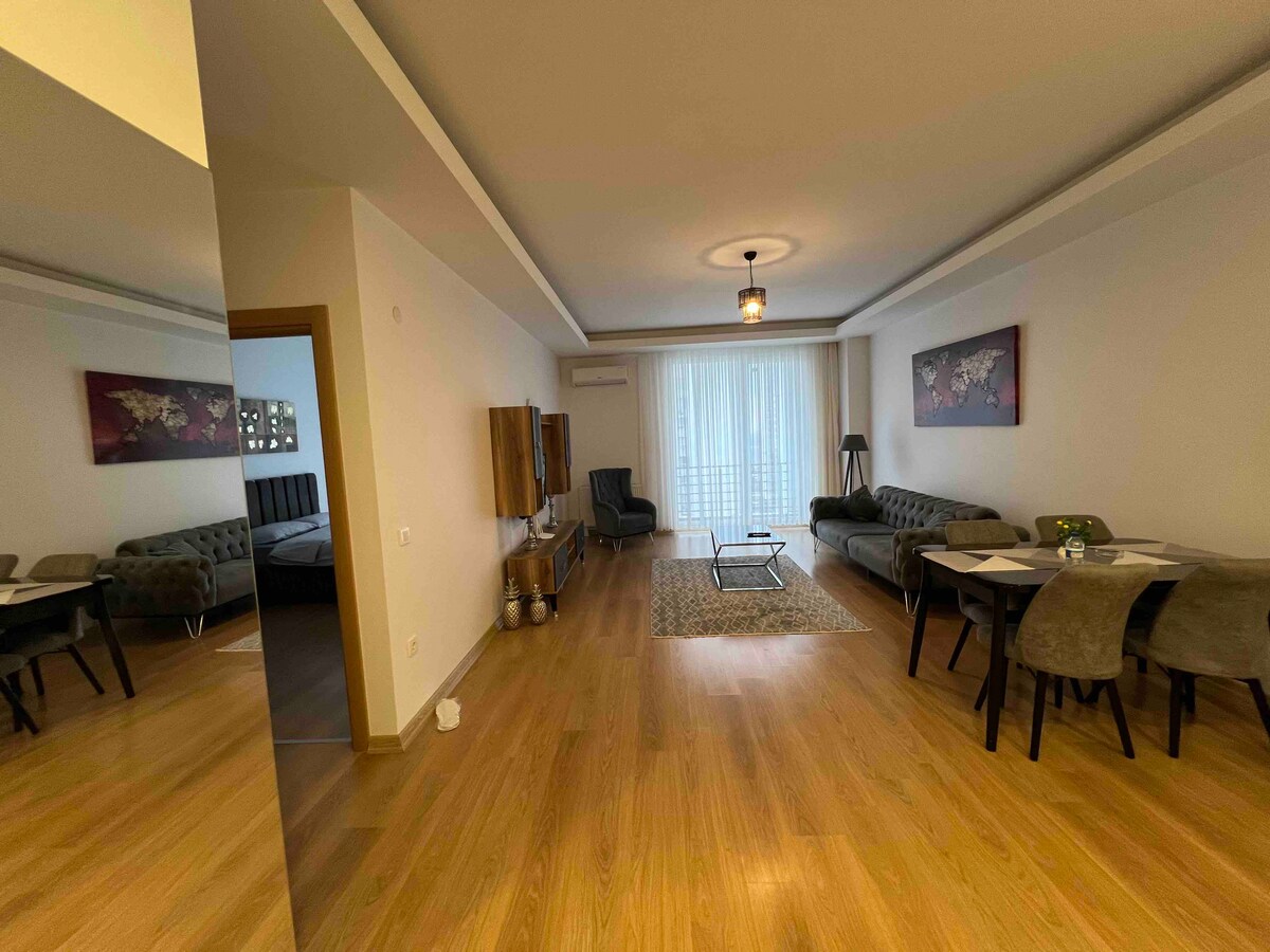 Enjoy a stylish experience in this centrally located apartment. Our apartment can accommodate 3 people with 1 queen bed and a sofa bed that can be converted to bed. Wi-Fi/Smart TV (you can watch movies for free with an active Amazon Prime account). Indoor parking is available. It has a clear view of the city.14 minutes from TUYAP congress by car. there is many materials at kitchen. The location is central, with many markets, cafes, restaurants, shopping malls, hospitals, and bus stops nearby.