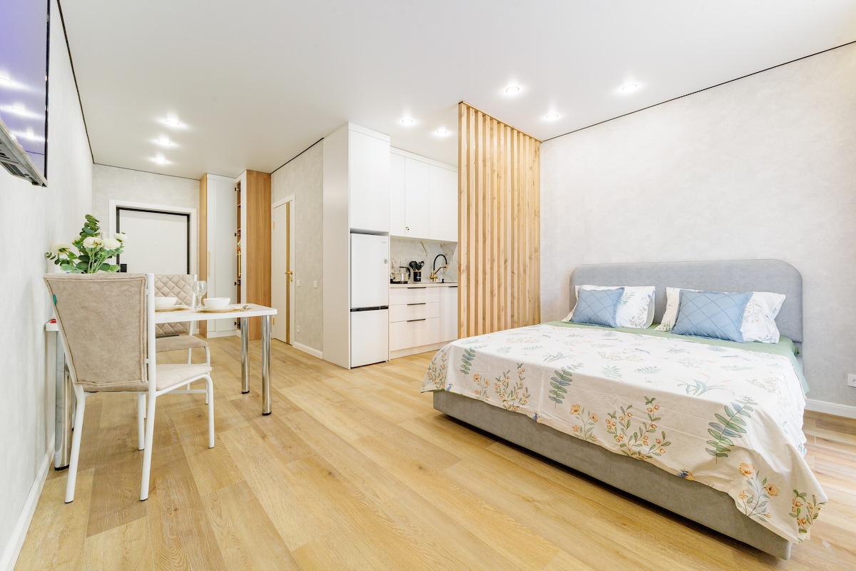 Contactless check-in, elevator. City views, double bed, 2 sofa beds, shower. Washing machine, hair dryer, iron, ironing board, clothes dryer. Kitchen with kettle, microwave, stove, oven, refrigerator, and kitchenware. Smart TV, Wi-Fi. The residential complex has: public parkings, bike rack, charging stations for e-cars, a playground, a workout area, a mini-football field, and gazebos. The old city center, embankment, city hall, and a historical building.