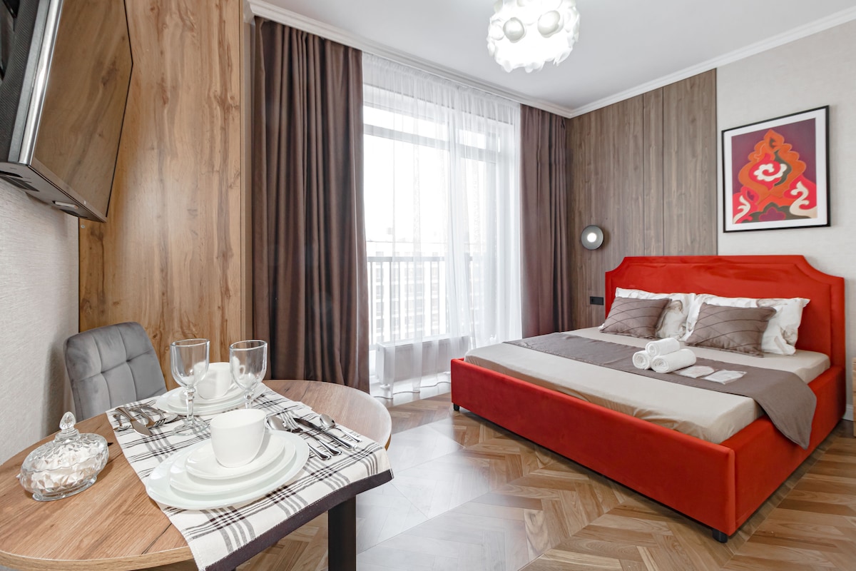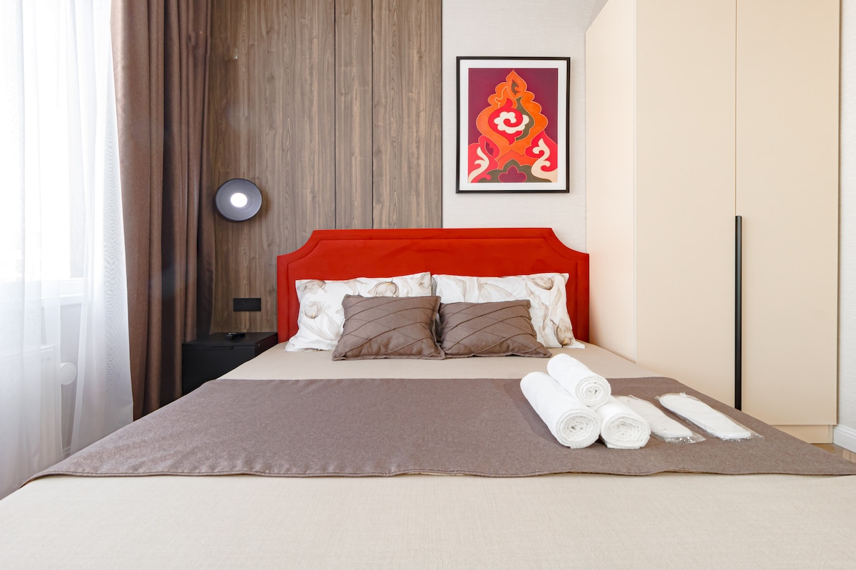 Остановитесь в стильном жилье с высоким уровнем безопасности (камеры видеонаблюдения, охрана, ресепшн) недалеко от самых интересных достопримечательностей, делового центра столицы, с возможностью прогуляться в Ботаническом саду в шаговой доступности. На территории апарт- отеля имеется кофейня, кофе аппарат, SPA, фитнес клуб, салон красоты, продуктовый магазин, кондитерская, рестораны, в том числе ресторан казахской кухни, бар, клуб, кальянная. Бесплатная парковка, зарядка для электромобилей.