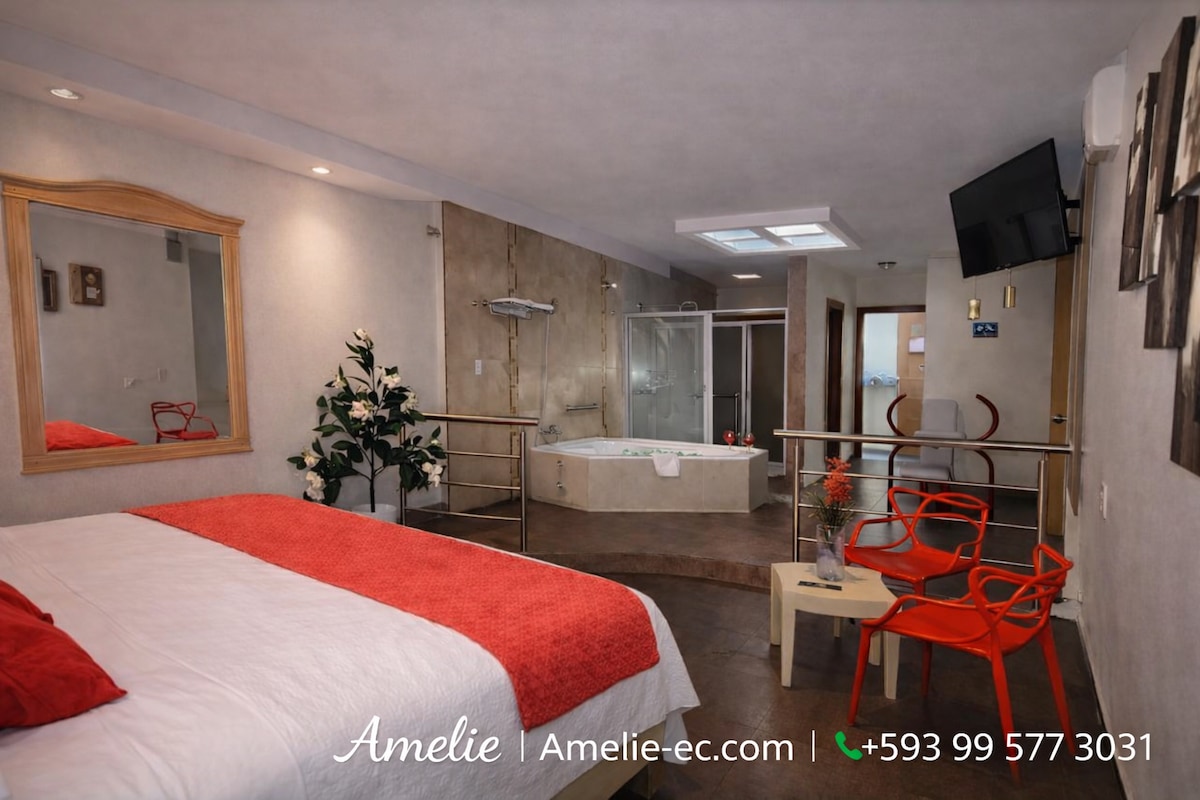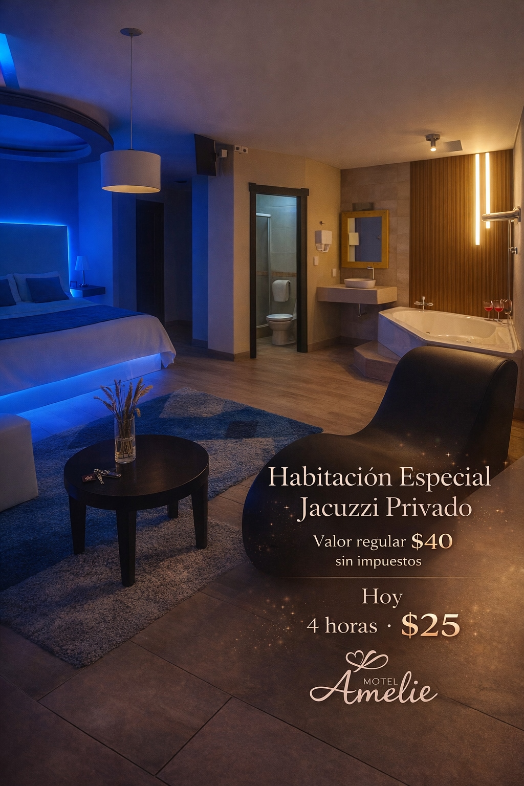 Descubre una experiencia diferente en la Suite Amelie, diseñada para parejas que buscan privacidad, comodidad y un ambiente único. Cada habitación tiene su propio estilo temático y detalles pensados para crear una noche especial. Disfruta de jacuzzi privado, agua caliente, Smart TV con internet, minibar y un delicioso menú de comida disponible durante tu estadía. Además, puedes complementar tu visita con masajes Perfecta para aniversarios, escapadas románticas o momentos inolvidables en pareja.