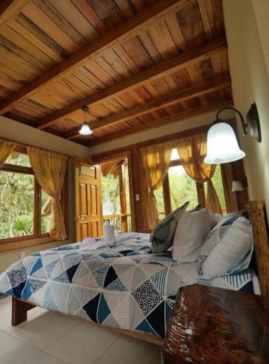 Quédate en un lugar elegante en Mindo, cerca de todo lo que quieras visitar. Cuentas con desayuno incluido. Disfruta del fácil acceso a tiendas y restaurantes de Mindo desde esta encantadora y moderna Suite. Está equipada con cama King, tina hidromasaje, balcón privado, sala de estar con sofacama, cocina totalmente equipada, piscina, muebles de exterior, parqueadero privado, camas colgantes frente al río, sala de masajes con costo extra.