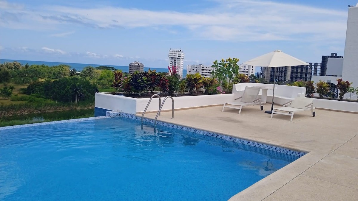 Este elegante departamento de 1 dormitorio en Tonsupa es el refugio perfecto para unas vacaciones junto al mar. Con un diseño moderno y acogedor, ofrece una sala de estar luminosa, cocina totalmente equipada y un dormitorio cómodo con cama queen size. A solo unos pasos de la playa, disfrutarás de su proximidad al océano. Ideal para relajarte, este espacio combina confort y estilo en un entorno idílico. ¡Ven y vive una experiencia costera romántica!