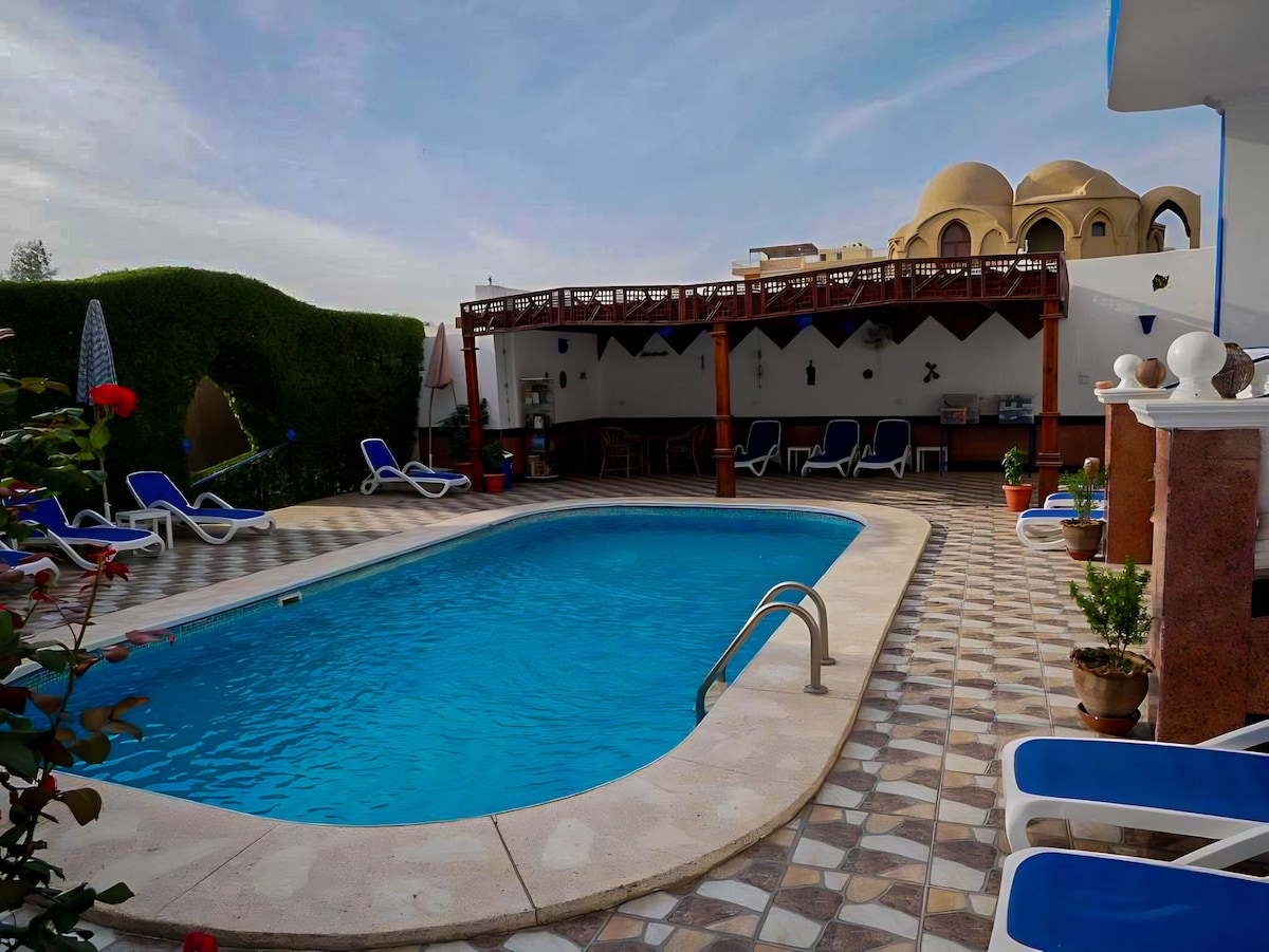 Make some memories at this unique and family-friendly place.The house consists of three floors .first floor is a very big living room built on the upper egyptian style called mondra . second and third floor each floor has it's own bathroom,kitchen with 2 bedrooms in each floor .the house is by the nile also can see esna temple from the other side .and a third view on one of the oldest mosque in luxor "Al masjid Ala3te3" ps : domestic pets are allowed