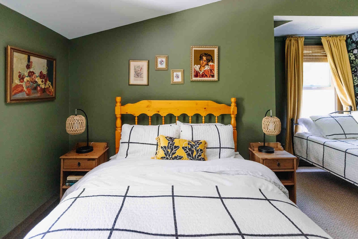 Free private parking. - Now: Late Check-in: Until 12am / Mutual Agreement - Please allow 1 hour prep. Private staircase - FREE WIFI - Built originally in 1848, one window facing crescent driveway - Be good with winding stairs (have no mobility issues) - Sunny big room. Perfect to work remote. Private back porch doors. 2 double mattress queen beds. Smoking on porch. No pets. Kitchen not included. Wares provided. Full bathroom. Microwave & Silent Fridge Same price: 1 to 4 guests!