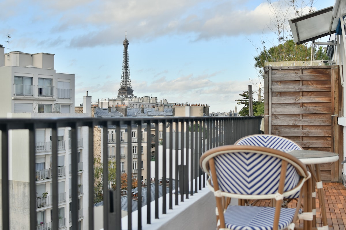 Top-floor haven with a large, sunlit balcony and an unobstructed Eiffel Tower view. Newly refurbished by a designer, it features an Italian shower, a comfy queen-size bed, and a quality sofa bed for groups of 3–4. Bright living/dining area, fast broadband and Netflix. Secure building in a vibrant neighborhood packed with cafés, restaurants, and shops. Metro station just 2 minutes’ walk. Perfect for couples, friends, or business stays.