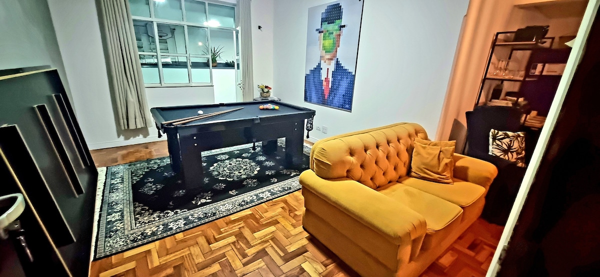 Este apartamento, pertencente à família há mais de 50 anos, agora reformado, apaixona qualquer um de imediato. À frente, a montanha do Cristo Redentor, com bioma predominante da Mata Atlântica; abaixo, as Termas Antônio Carlos, com suas águas que têm o poder de cura, e os imponentes jardins da praça central. Da janela da sala testemunha-se o movimento da cidade. Cafés, restaurantes, padarias, supermercados, estacionamento e comércio variado podem ser frequentados a pé.