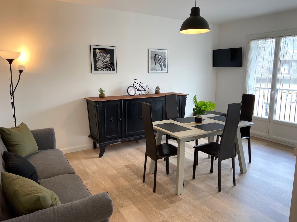 Espalion est situé dans la vallée du Lot entre le Causse et l'Aubrac . Appartement se situe à 100 m du centre ville, dans une résidence au 2e étage , parking gratuit et local à vélo sécurisé -Capacité d'accueil: 4 personnes. -Terrasse couverte . -Dans le salon un canapé, téléviseur -Cuisine équipée (lave-vaisselle, réfrigérateur-congélateur, four électrique + plaque induction, micro-ondes. 1er chambre avec lit en 140 . la 2em deux lits en 90 Salle de bain : douche, wc separé