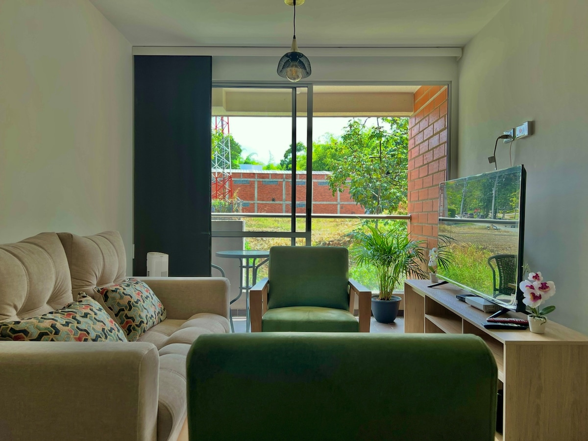 Tranquilo y con una vista única. 📍Estratégicamente ubicado A 5 min del aeropuerto ✈️ 3 min de Expofuturo y el estadio 4 min del C.C. Unicentro 15 min del Parque Ukumari 20 min del centro 30 min de Filandia y Salento Relájate con el sonido de los pájaros y el río. Un apartamento moderno con luces inteligentes en las habitaciones, cocina completamente equipada. Con un espacio especial para que trabajes. Tendrás Netflix, HBO MAX y DISNEY. Vestier en el cuarto principal. Tiene plancha a vapor.