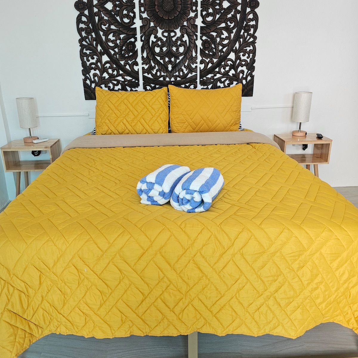 Enjoy the private downstairs apartment in our two-story house. It features a full open kitchen, indoor and outdoor dining spaces, a queen bed in the bedroom with AC, a sofa that pulls out to become a second bed, and a shower with hot water. There is smart TV. The entrance is private and parking is right in front of the apartment. It's located in Villa Borinquen, a 5 minute drive or 25 minute walk from the ferry station and surf breaks.
