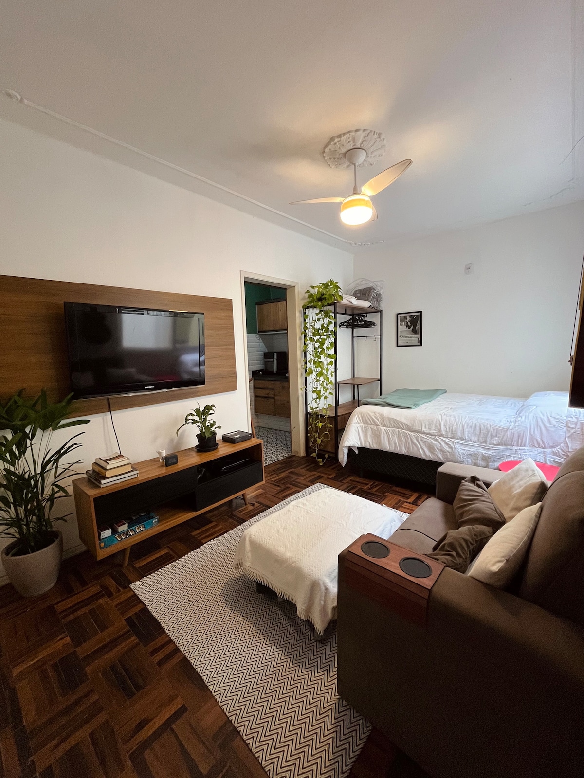 Viva uma experiência única neste estúdio acolhedor e elegante, projetado com atenção aos detalhes para oferecer conforto, funcionalidade e muito estilo. O ap azul planejado é um diferencial exclusivo, com iluminação suave e decoração pensada para relaxar, móvel inteligente e versátil que se transforma em mesa de jantar ou apoio para cozinhar — perfeito para quem valoriza funcionalidade. Piano digital disponível para relaxar, praticar ou se inspirar. Smart TV, Wi-Fi.