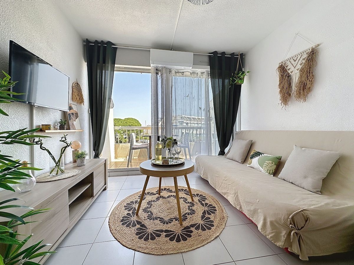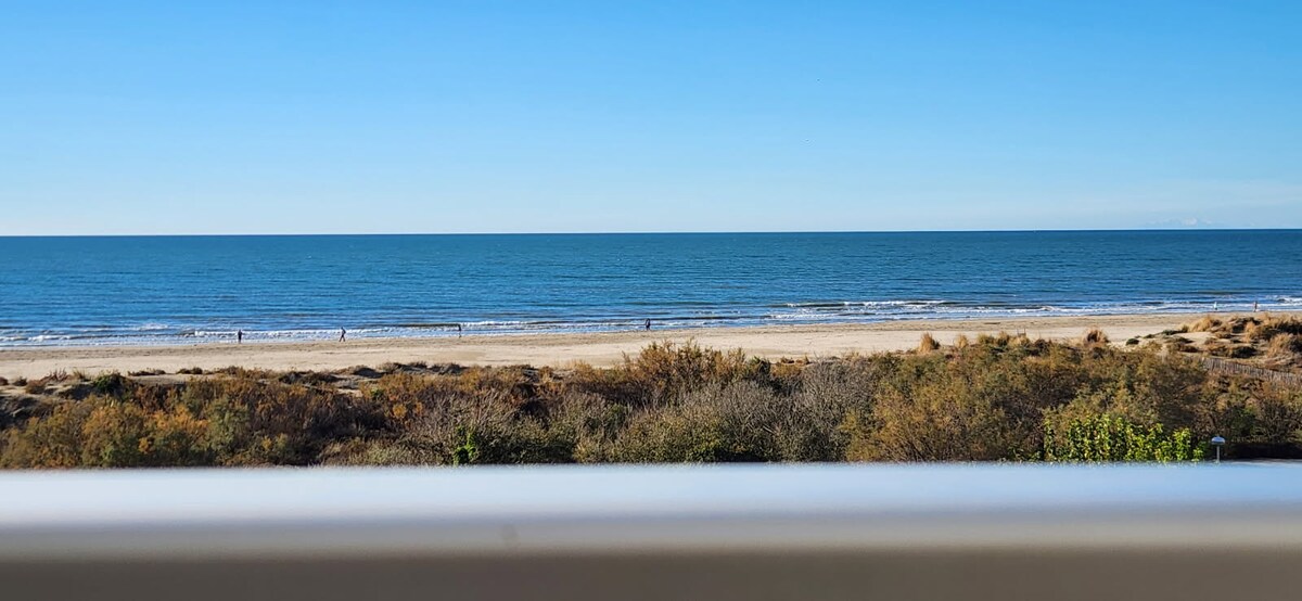 Bright apartment just steps from Boucanet Beach, less than a 5-minute walk from Grau-du-Roi town center. Located on the 2nd floor of a beachfront building, it features a loggia with stunning Mediterranean views. Relax and enjoy breathtaking sunsets. Perfect for a seaside getaway, blending relaxation and adventure. Book now and experience the dolce vita in Grau-du-Roi!