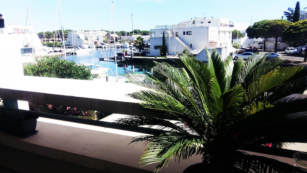 Le rêve au soleil de Camargue ! MARINA ENSOLEILLÉE, située dans Port-Camargue, côté plages sud : L'appartement, au 1er étage, chaleureux et confortable, avec vue imprenable sur le plan d'eau et les arbres environnants, a été entièrement repeint en juin 2023. La chambre est exposée Est avec le soleil le matin et le salon et la cuisine, exposés Sud-Ouest, sont très lumineux toute la journée. Une terrasse sans vis-à-vis permet de déjeuner et se détendre, à 300 m des plages et commerces.