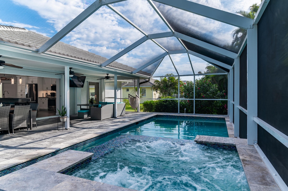 Have fun with the whole family at this stylish Naples Costal Paradise Home. Tropical Oasis within minutes to the beaches, restaurants, shopping, entertainment. Heated pool/spa no jets, Wi-Fi, big lanai with BBQ and more. House is a 3-bedroom, 2-bathrooms fully renovated in coastal contemporary style with tile floors, coastal art, big kitchen and more. King bed, queen bed, 2 full beds, big modular couch. House will comfortably sleep 6 adults plus children. It has all you need for great vacation.