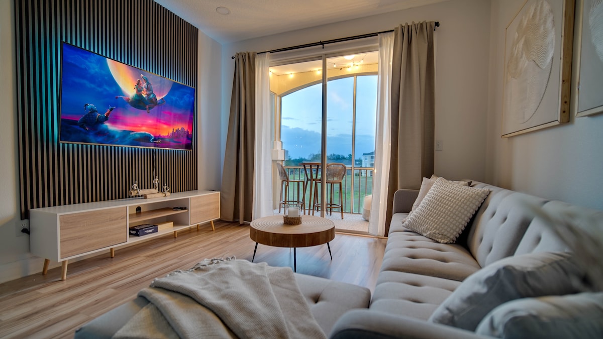 ✨ 7 Minutes to Disney • Sleeps 4 • Pool, Gym, Balcony Modern 1BR resort condo 7 mins from Disney. Sleeps 4 with king bed + sofa sleeper. Walkable to shops & short drive to all major parks. Enjoy a full kitchen, WiFi, Smart TVs, private balcony with nightly fireworks, resort pool, 24/7 gym, and in-unit laundry. Perfect for families, couples, or remote work stays.