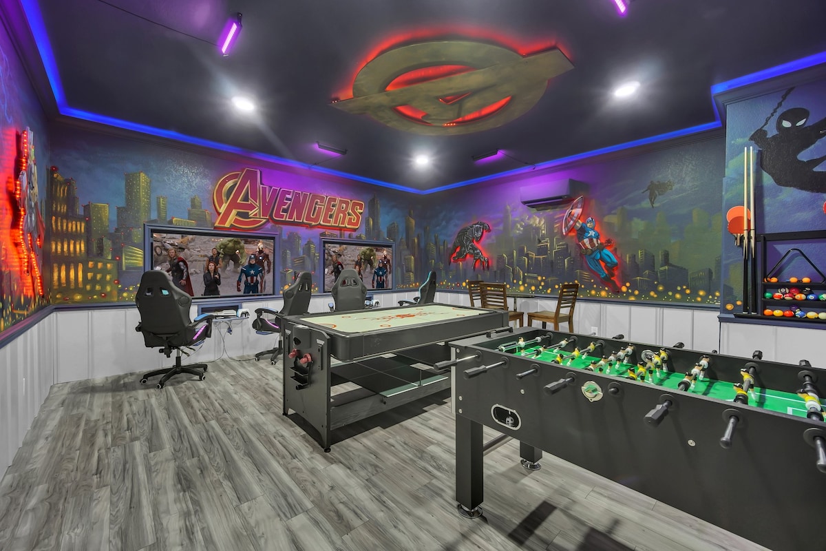 Welcome to our delightful 5-suite vacation home! Enjoy themed rooms such as Star Wars, Minions, and Mickey Mouse, along with two elegant adult suites. Experience endless entertainment in our gaming room with four arcade machines. Ideal for families or groups, this charming home promises a memorable stay. Your adventure awaits! The following extra services include additional costs: Grill Early Check-in Late Check-out