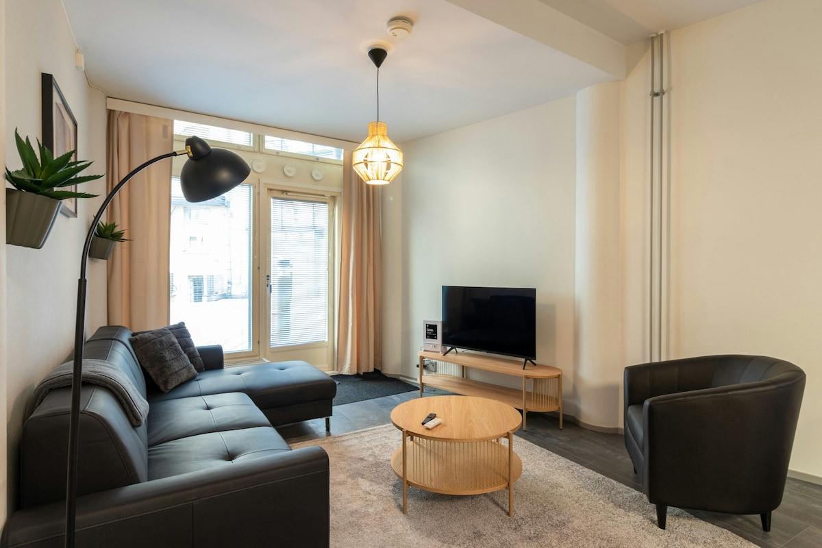 This modern and comfortable studio apartment is for two or a family with two kids. Comfortable and high-quality beds guarantee a good night’s sleep for two while the sofa-bed in the living room is perfect for the little ones in the family. Room is equipped with flat screen-TV, electric kettle, coffee maker, toaster and a hairdryer. Well-equipped kitchen has equipment for cooking, refrigerator, microwave-oven, dishwasher and integrated stoves for preparing all your favorite dishes.